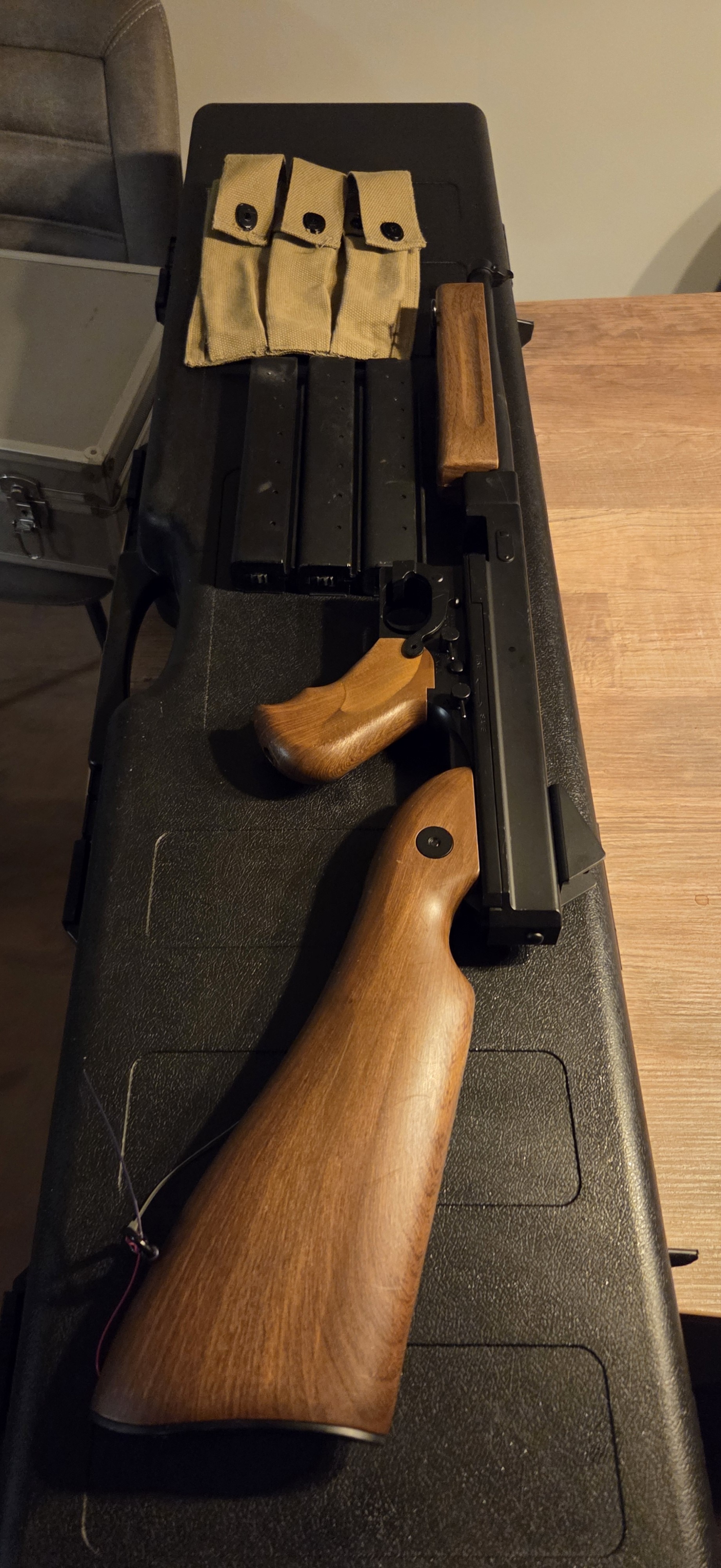bij de thompson zitten 3 high cap mags en een magpouch voor de magazijnen, ook word er een batterij meegeleverd.