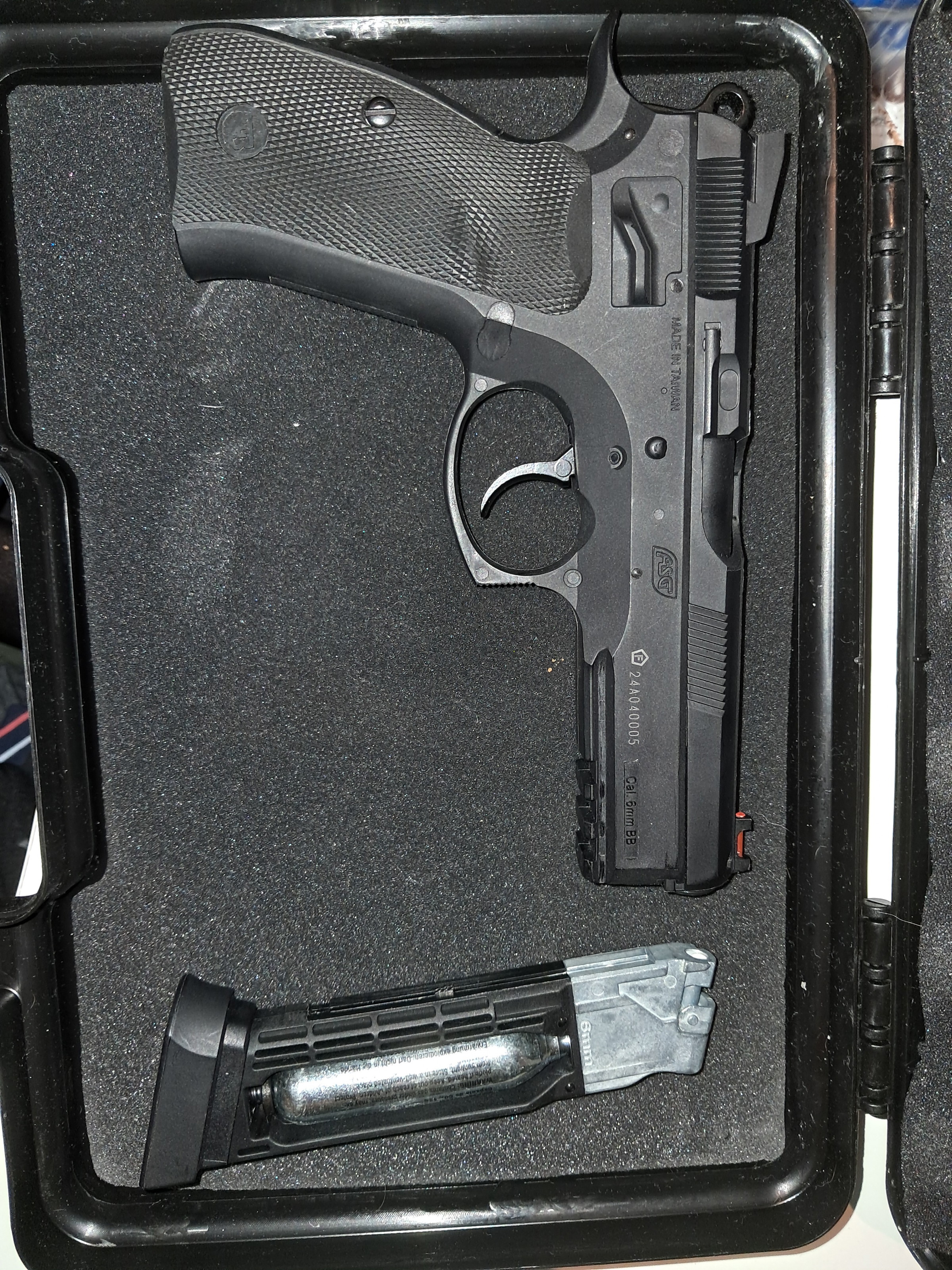 Werkt op Co² patronen. 1 magazijn. Evt kan je de rest van de Co² patronen erbij krijgen.