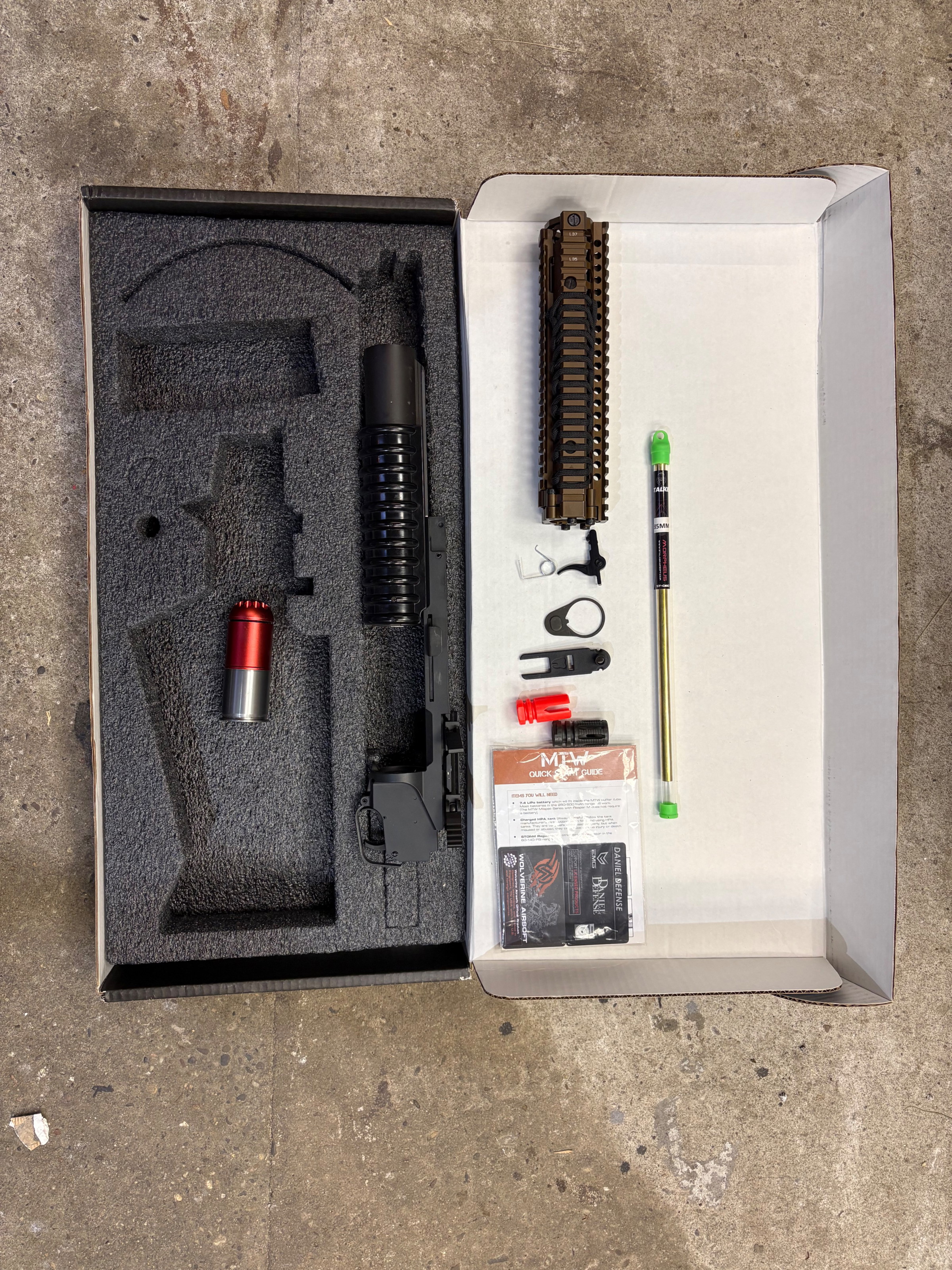 The first licensed MTW, in partnership with EMG! This Daniel Defense MK18 replica is machined from real AR-15s forgings and specced to the same standards as the real MK18, including CNC engraved trademarks on the lower receiver and laser engraved trades on the upper. Designed for HPA and built like the real thing with true tool-less disassembly using real steel springs, detents, and takedown pins. Furniture features genuine Daniel Defense stocks and grips with licensed rails.