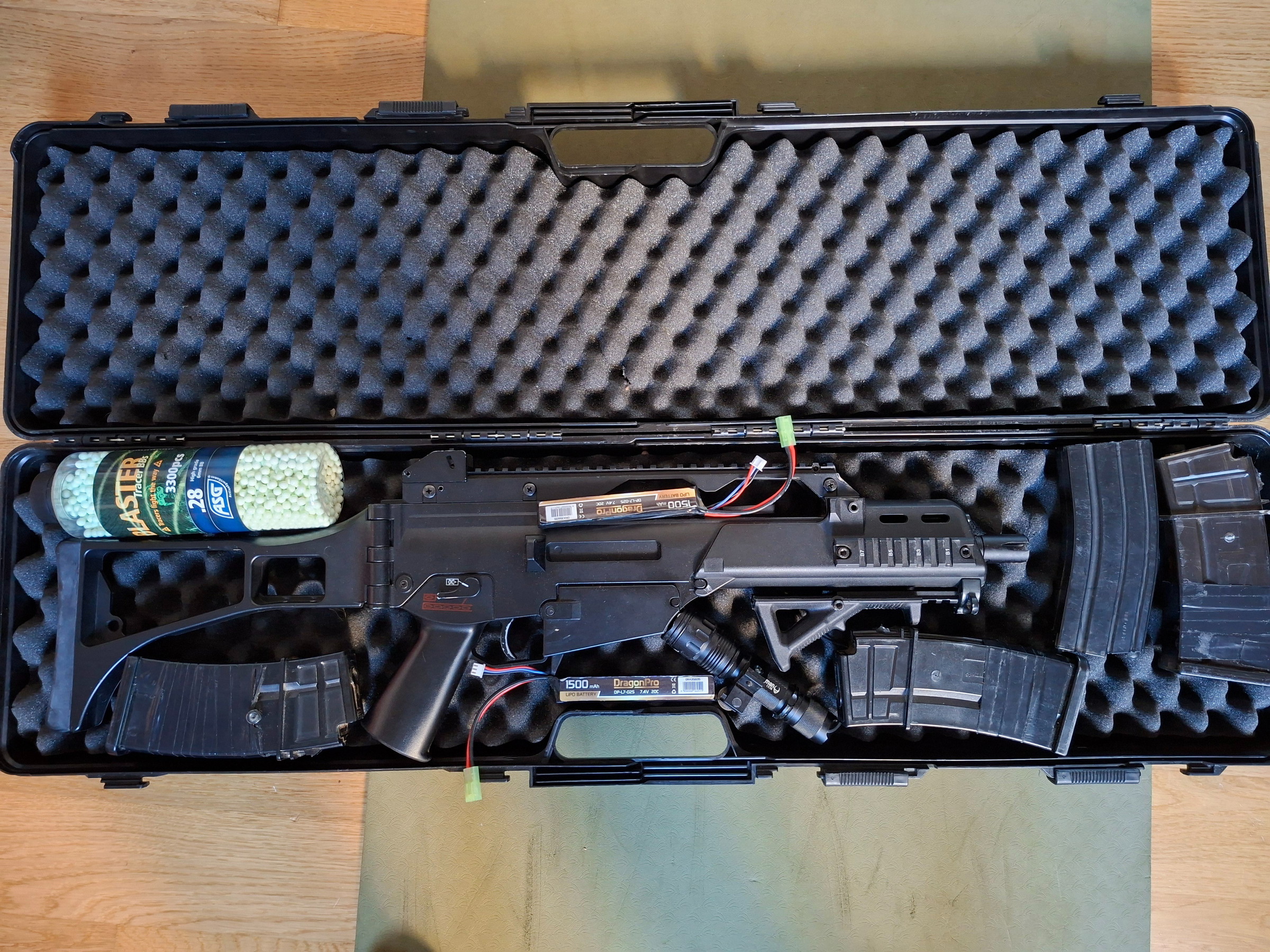 Deze G36 werkt naar behoren. Er zitten 2 accu's bij,Β een lampje, een speedloader, 3 mags, het koffer en gratis bbb's.