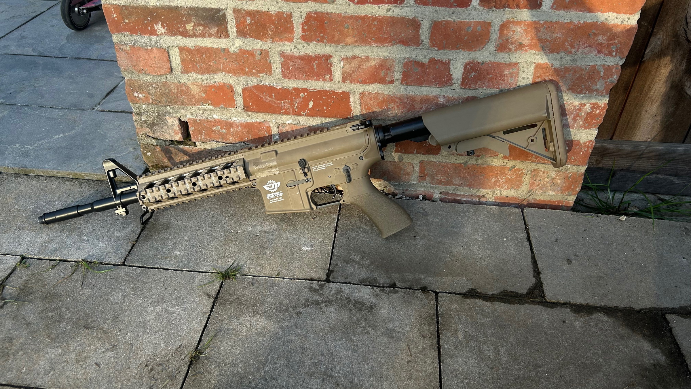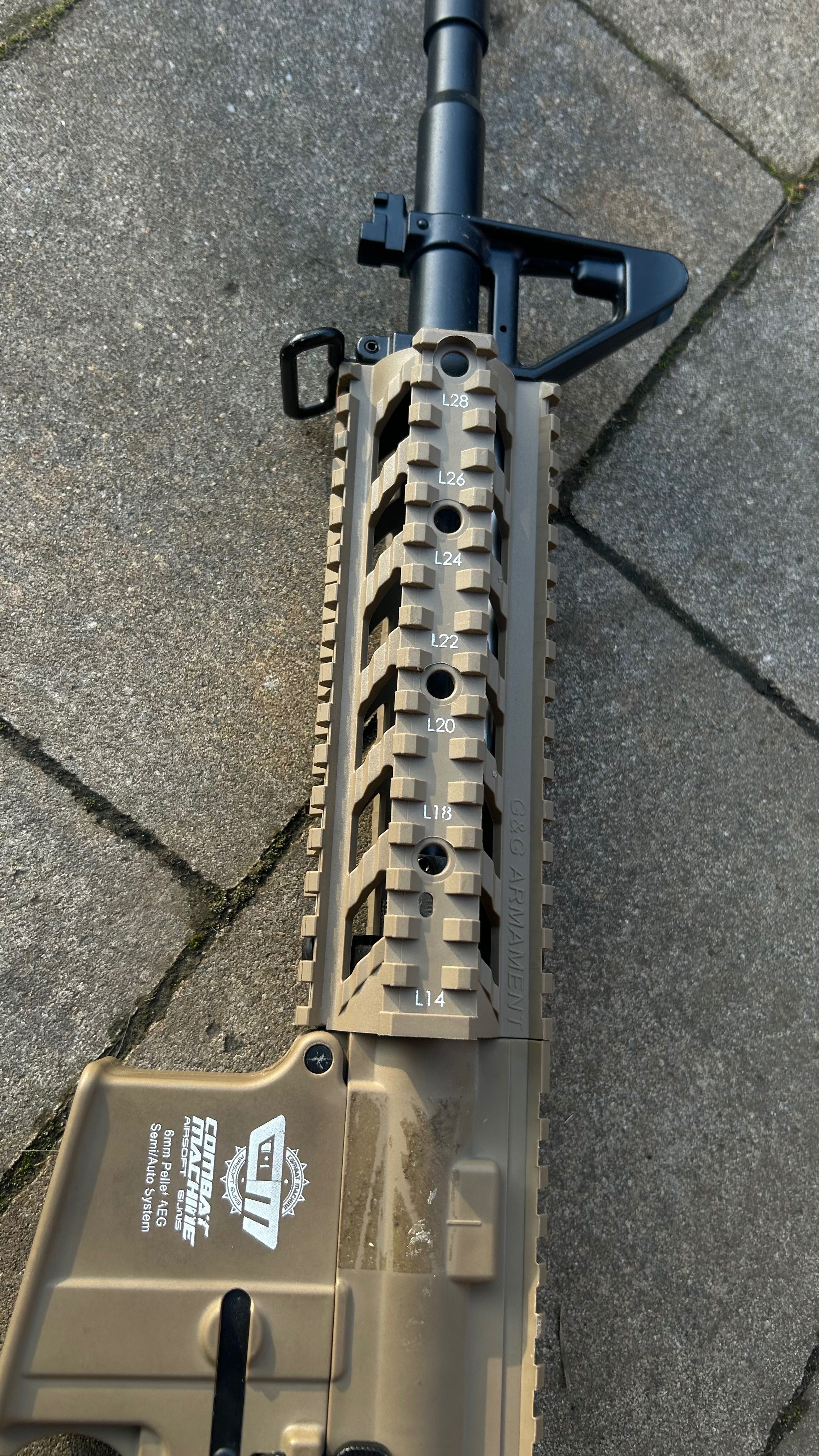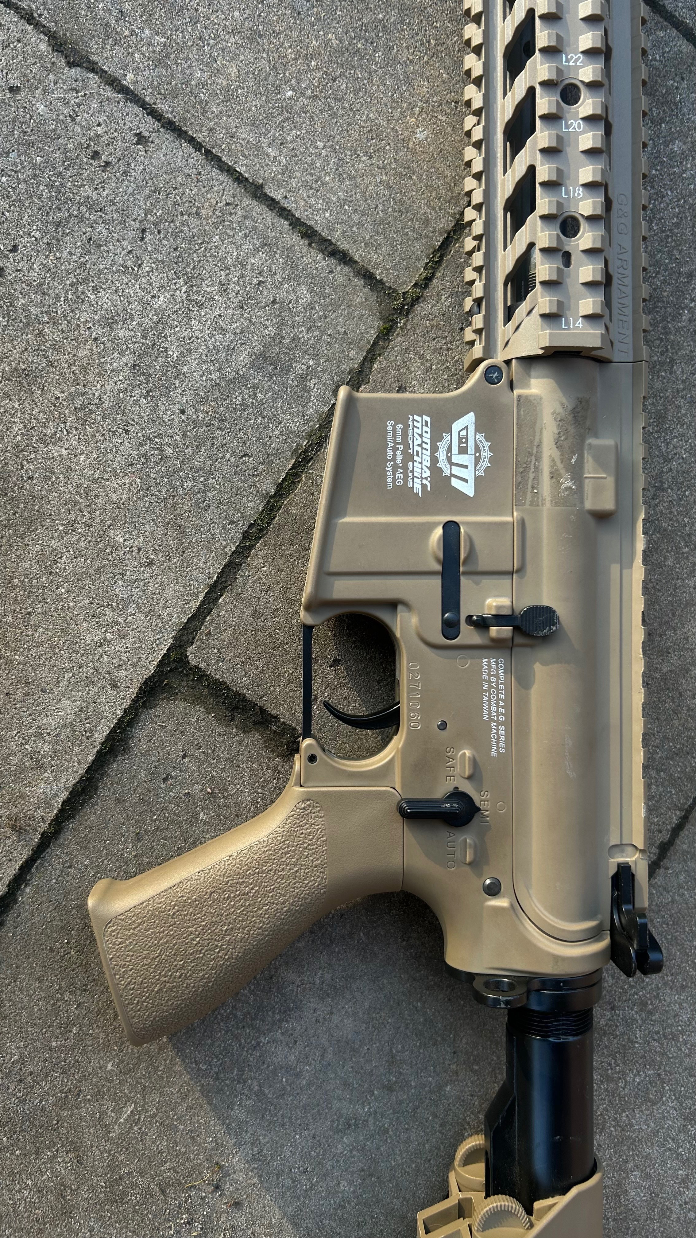 Merk: G&G Naam: G&G Combat Machine CM16 Raider Kleur: DST Tan Schietmodus: Semi-automatisch, Volautomatisch Receiver: Hoogwaardig polymeer Voorste handgreep: Hoogwaardig polymeer railsysteem Bushings: Metalen bushing Gewicht: 2,1 kg Blowback: Geen FPS: 380-400 FPS met .20g BB's Aanbevolen batterij: G&G 9,6V NiMH 1600mAh Nunchuck batterij Werkt met de G&G 11,1V LiPO 1100mAh 3-delige batterij (maar de motor slijt sneller