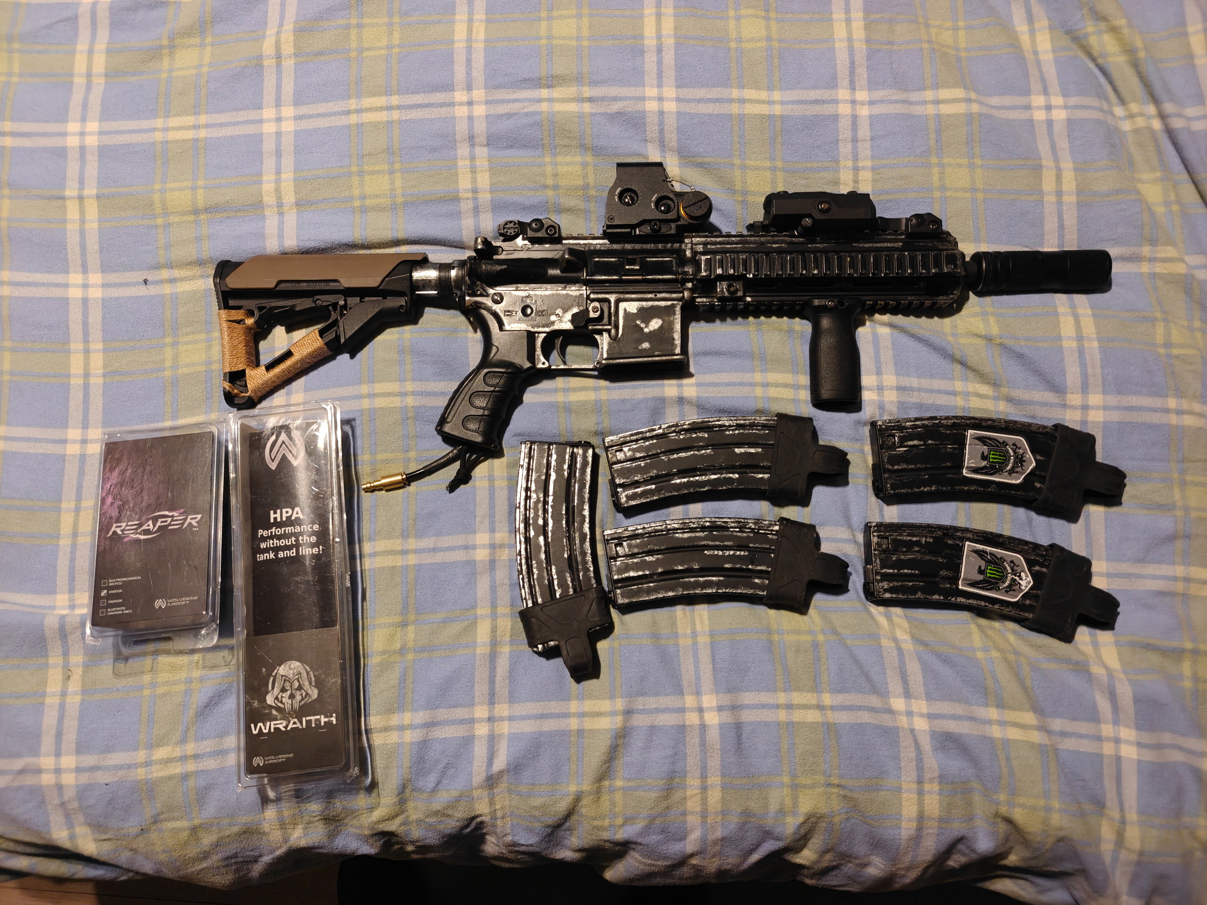 Hij komt ook met hpa baterij ,5 bij pasende mags een reddot , supresor en een peq box.