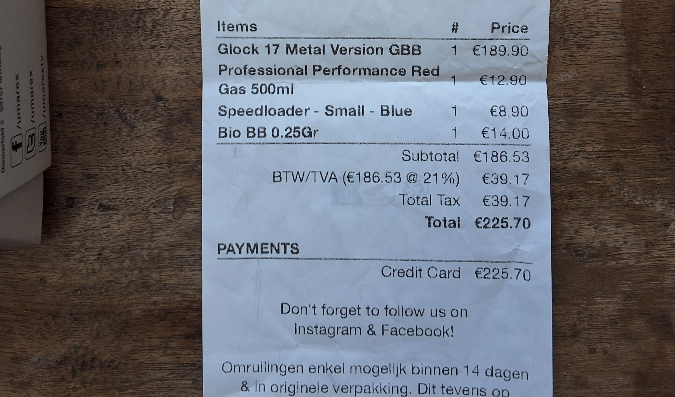 Nieuwprijs was 225 euro, gekocht bij Airsoft Doctor Mechelen.