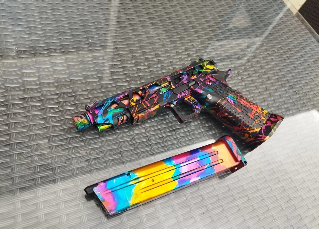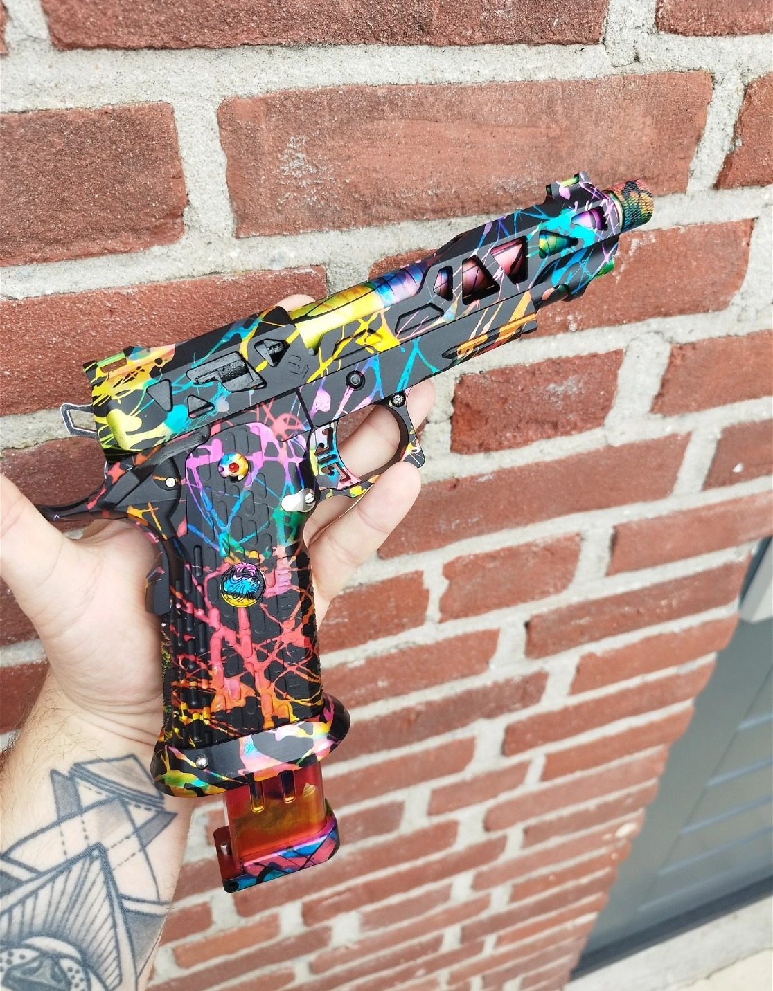 De hicapa en de extended mag zijn beide volledig en op unieke wijze geanodiseerd, dit zorgt ervoor dat je niemand gaat tegen komen met dezelfde Hicapa! Naast de unieke looks zit er ook nog een super gewilde en niet meer te verkrijgen Poison speedQB slide op, en niet zo maar 1 ... het is de allereerste ooit gemaakt met serie nummer #0001 , hoe bijzonder wil je het hebben?!
