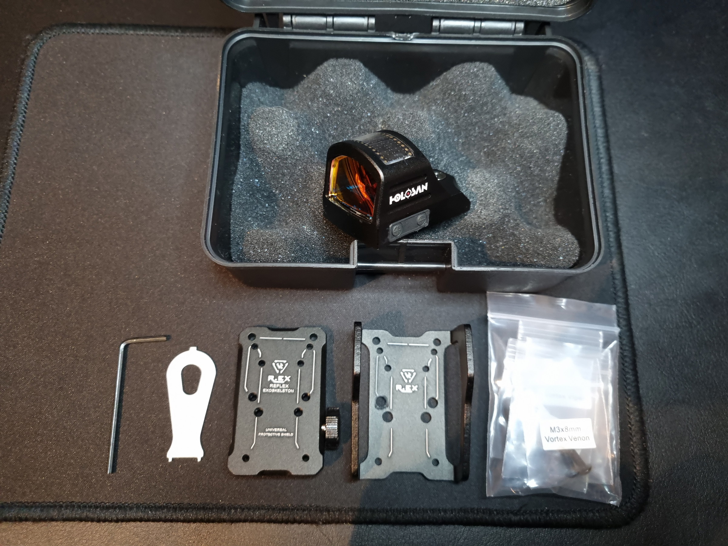 Inclusief originele doos (zoals afgebeeld) + adapter plate voor ris rail + beschermkap + meerdere soorten schroefjes.