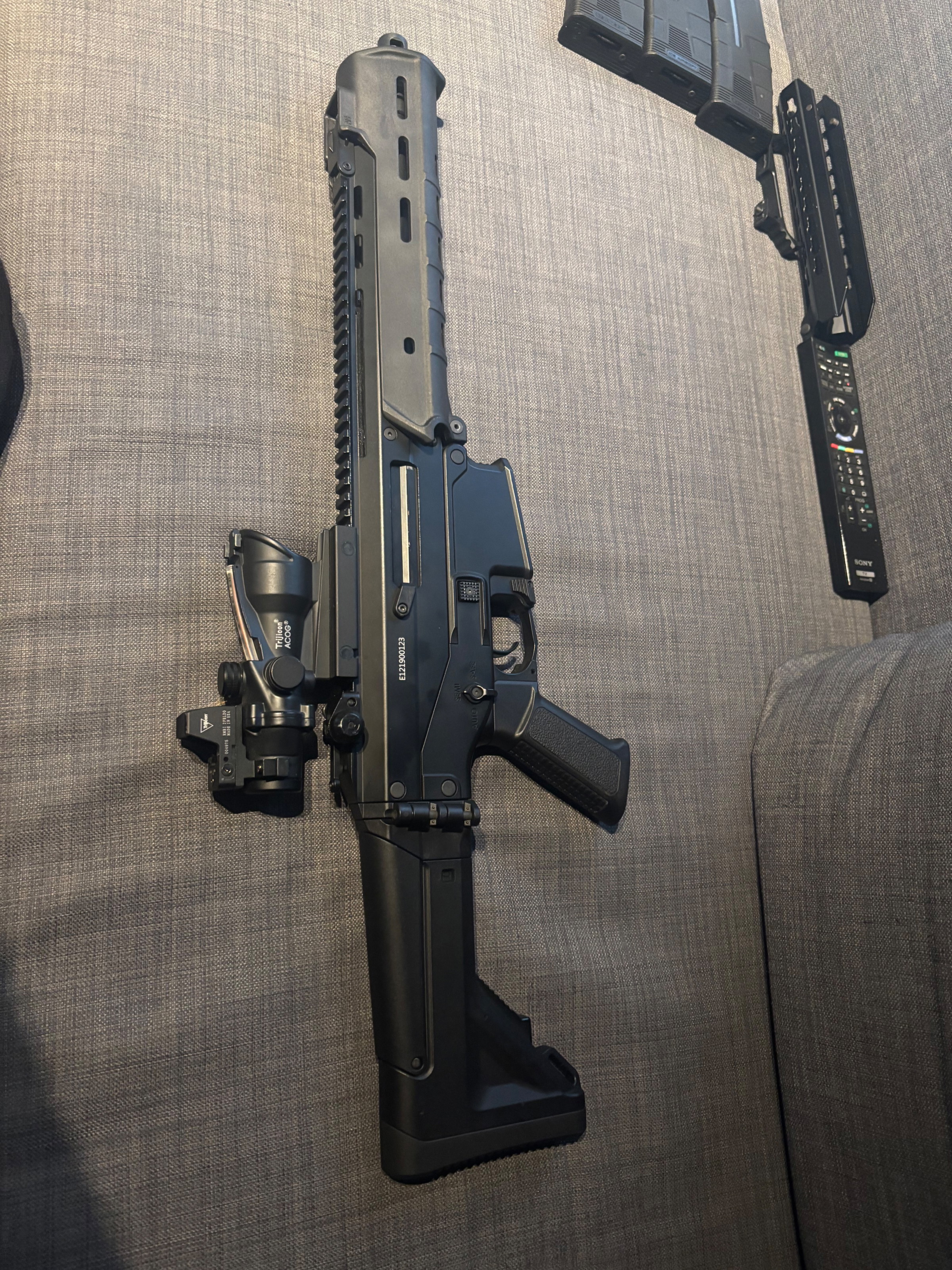Daarna komt hij nog met een magpull handguard en de originele, de ACOQ is een vaste 4X en is ook een Reddot vanboven op gemonteerd.Â