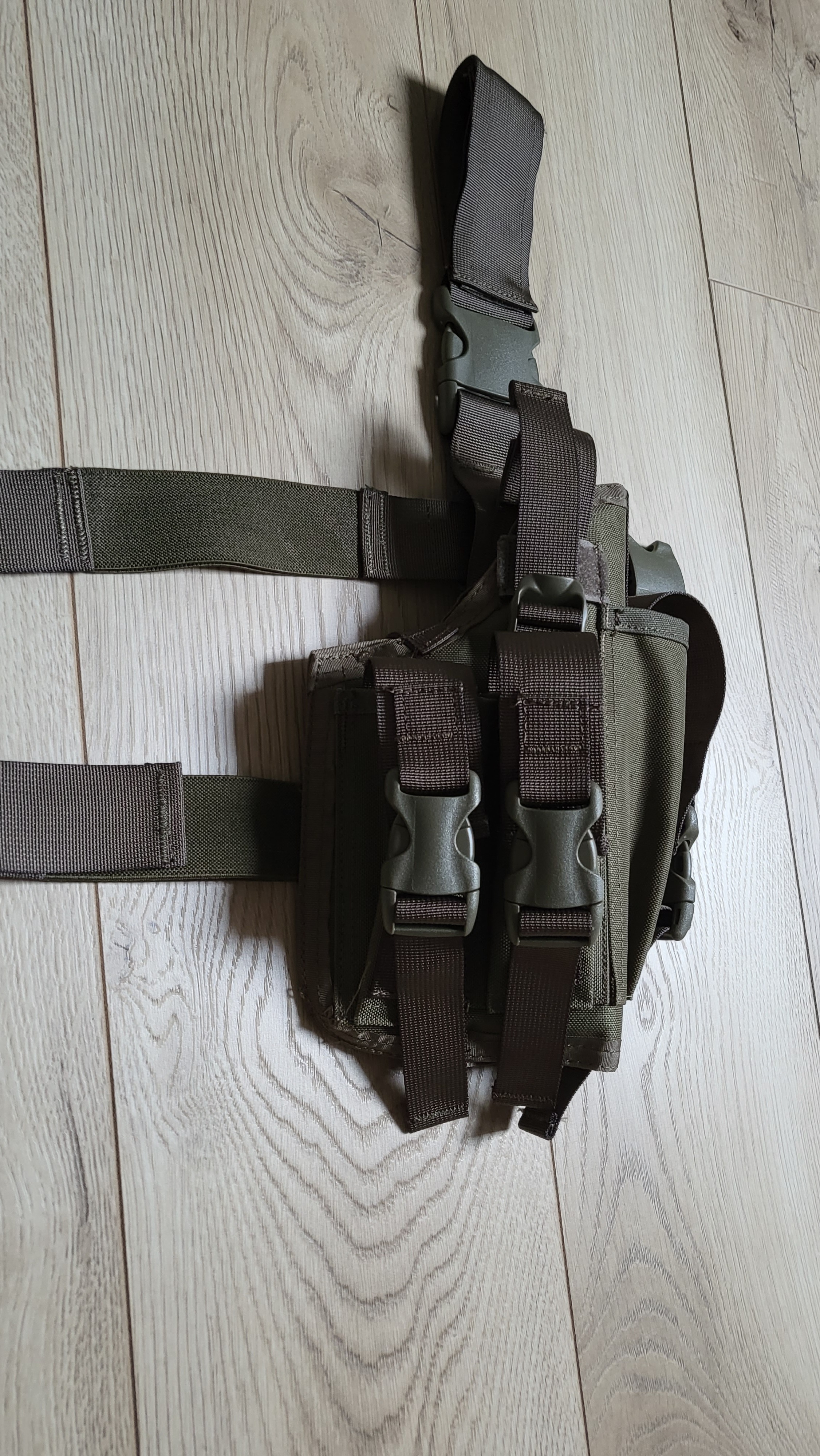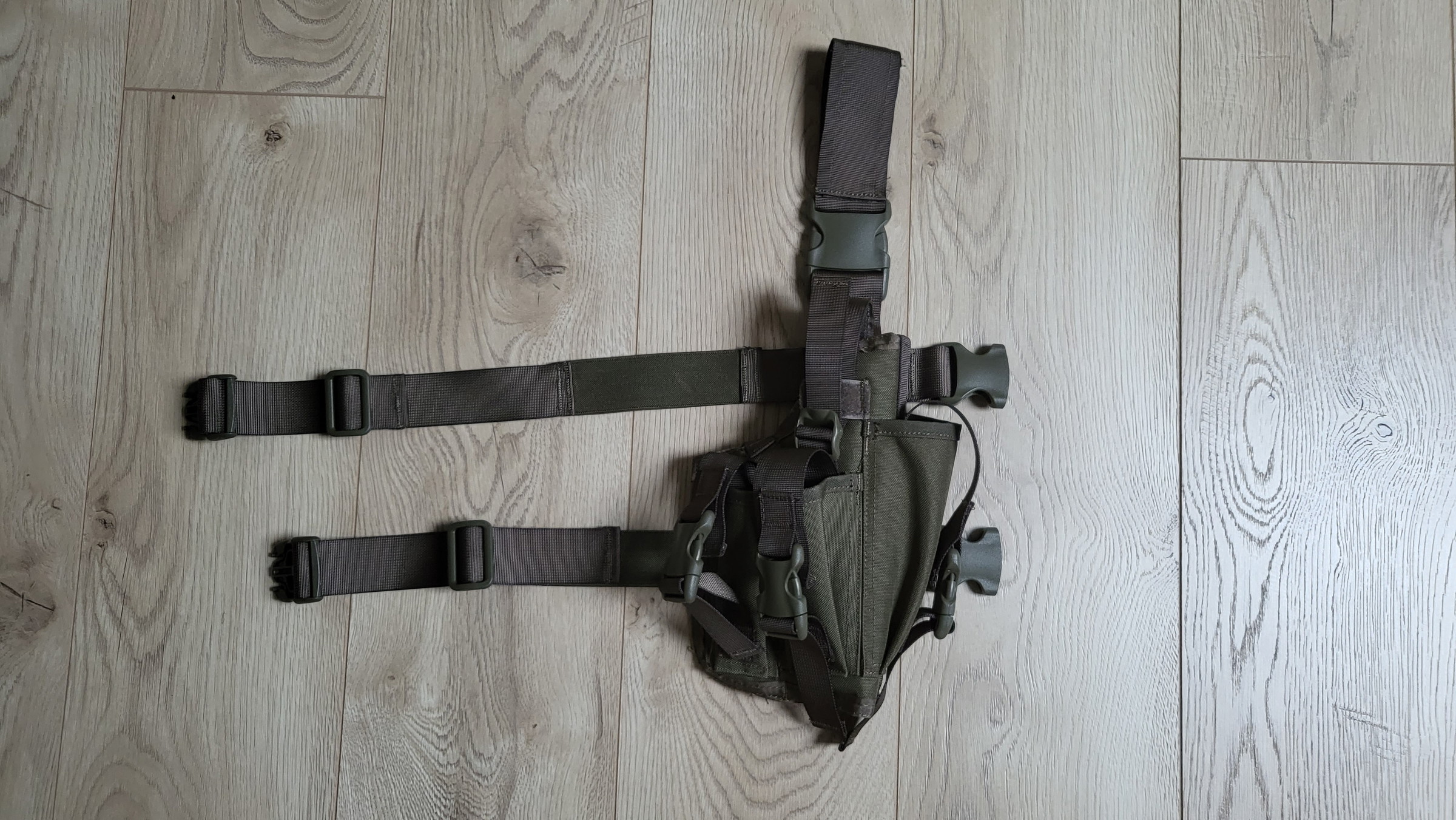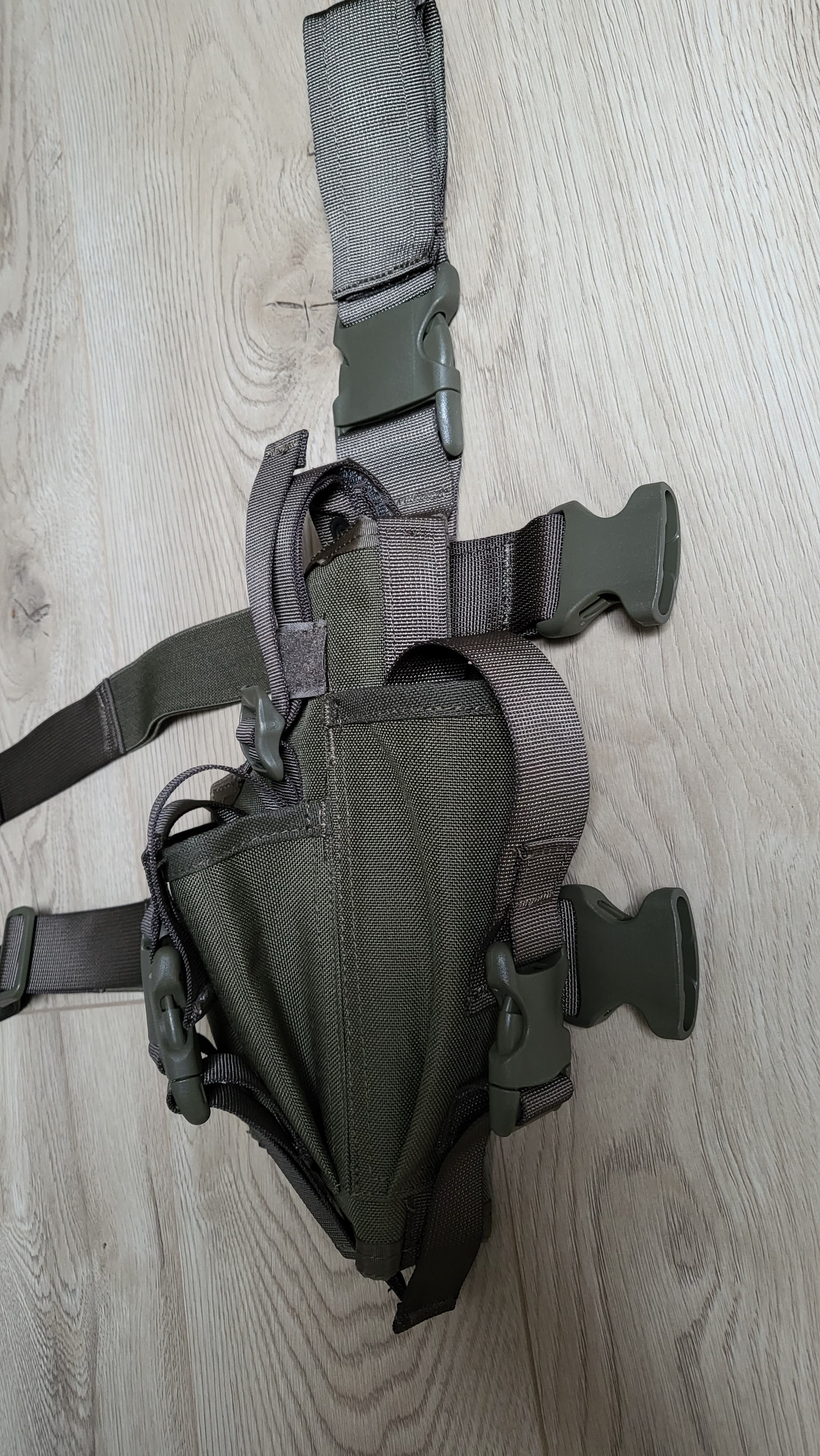 Universele holster met 2 pistol mag pouches en 1 langere pouch voor bijvoorbeeld een extended mag. De holster heeft 1 clip om aan je riem te bevestigen en 2 voor om je been. Ik zelf heb hem gebruik met een Tokyo Marui G18C + Flashlight en daarbij 2 mags + 1 extended mag. De holster is 1 keer gebruikt tijdens een skirm en heeft geen schade.