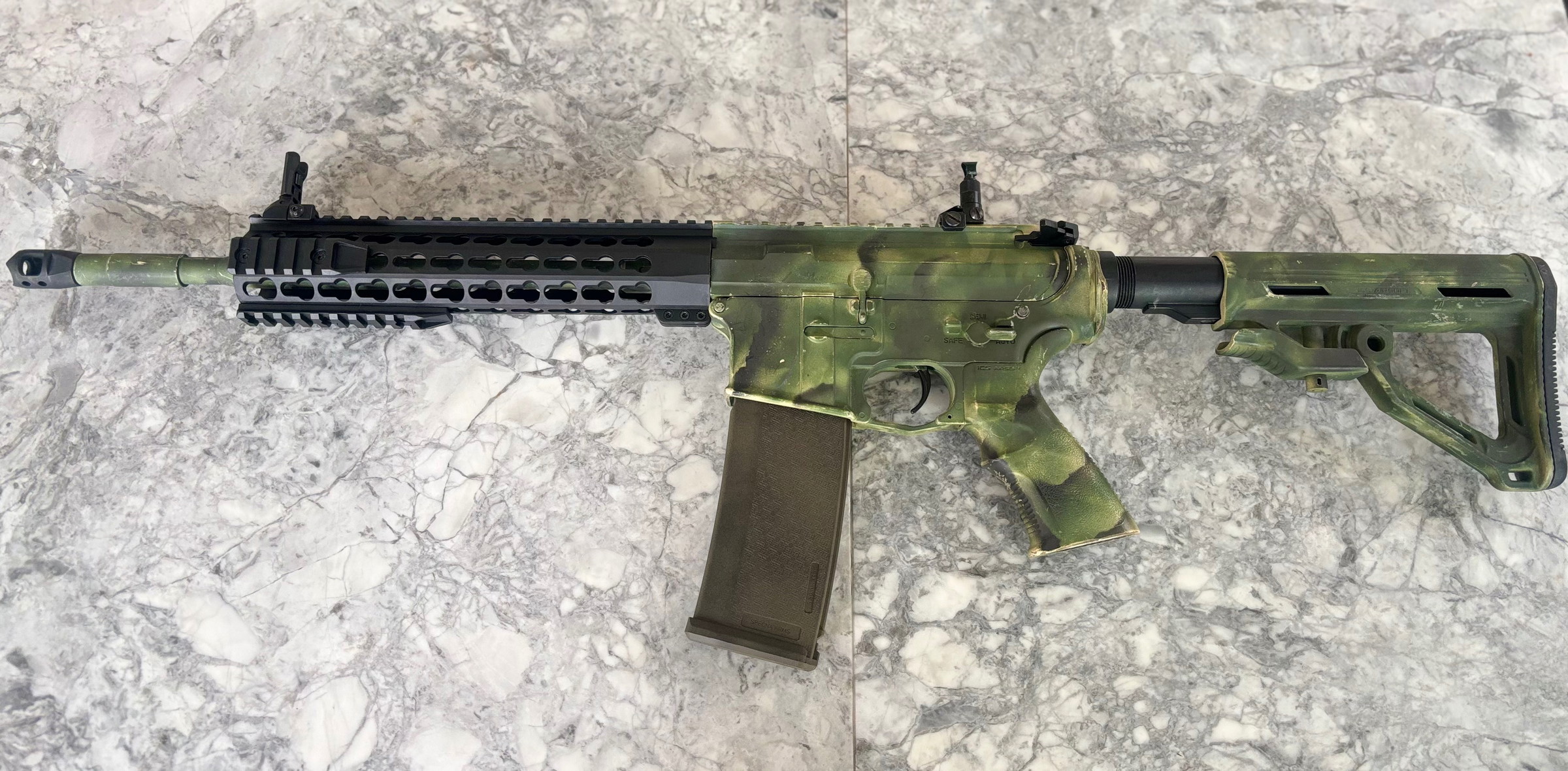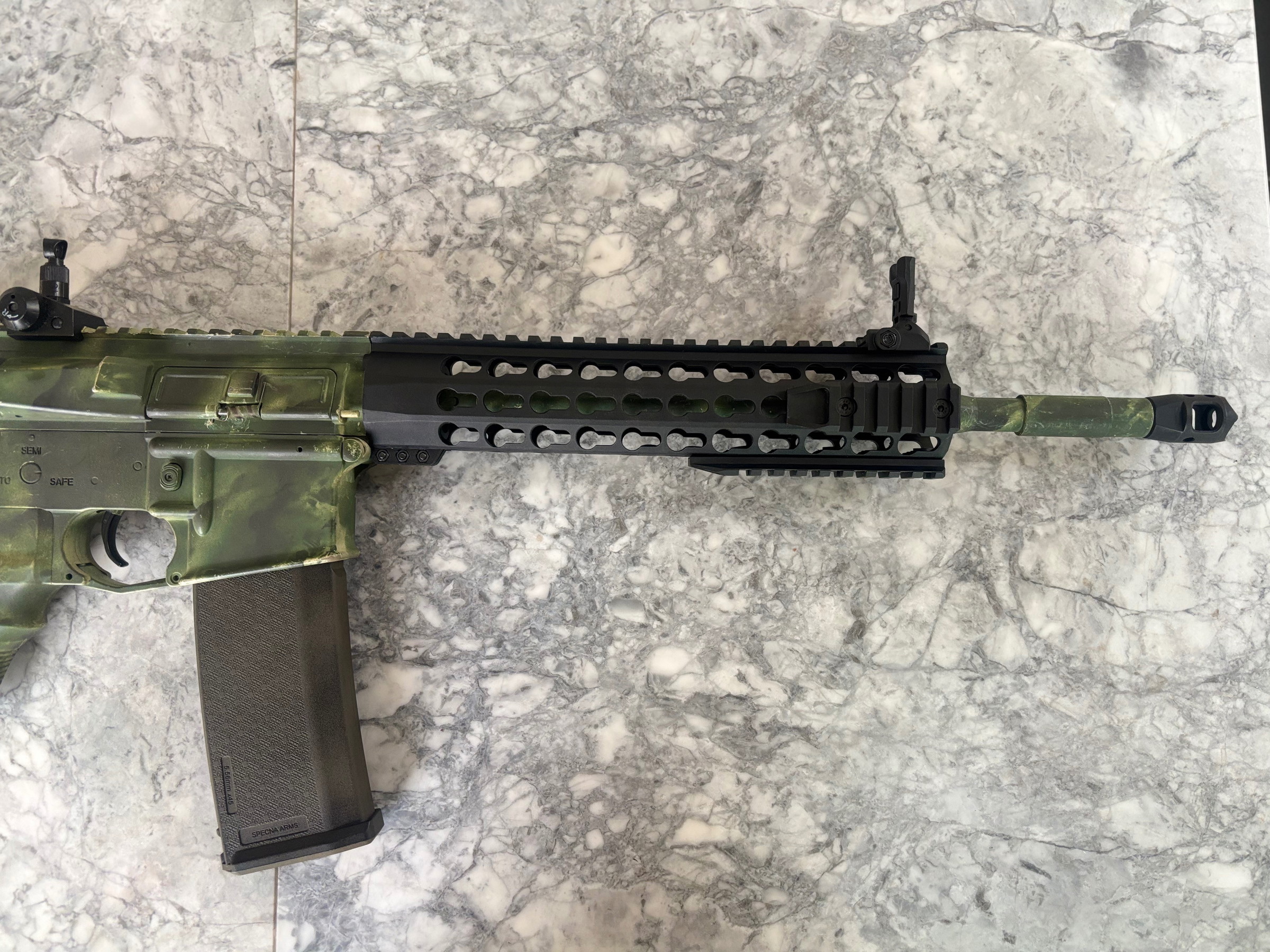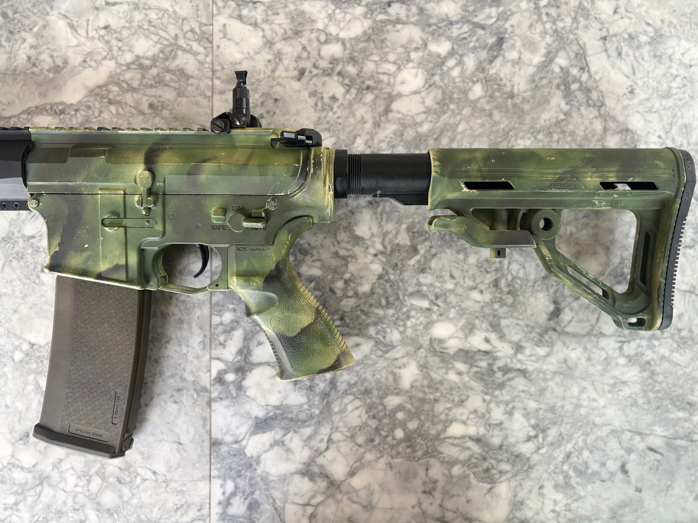 Door de vorige eigenaar voorzien van een camo patroon/kleur. Zit er erg netjes op en beschadigt niet snel.