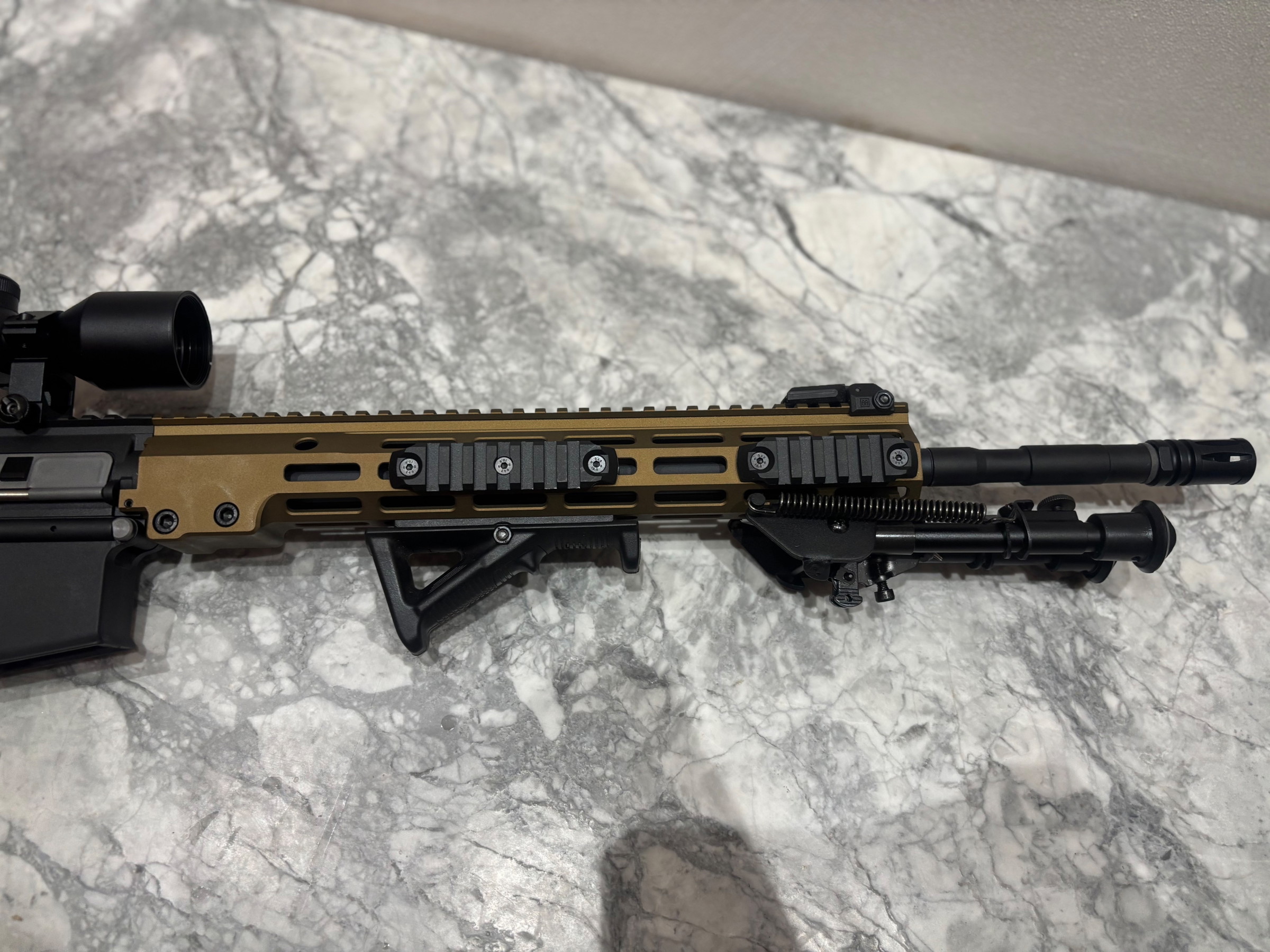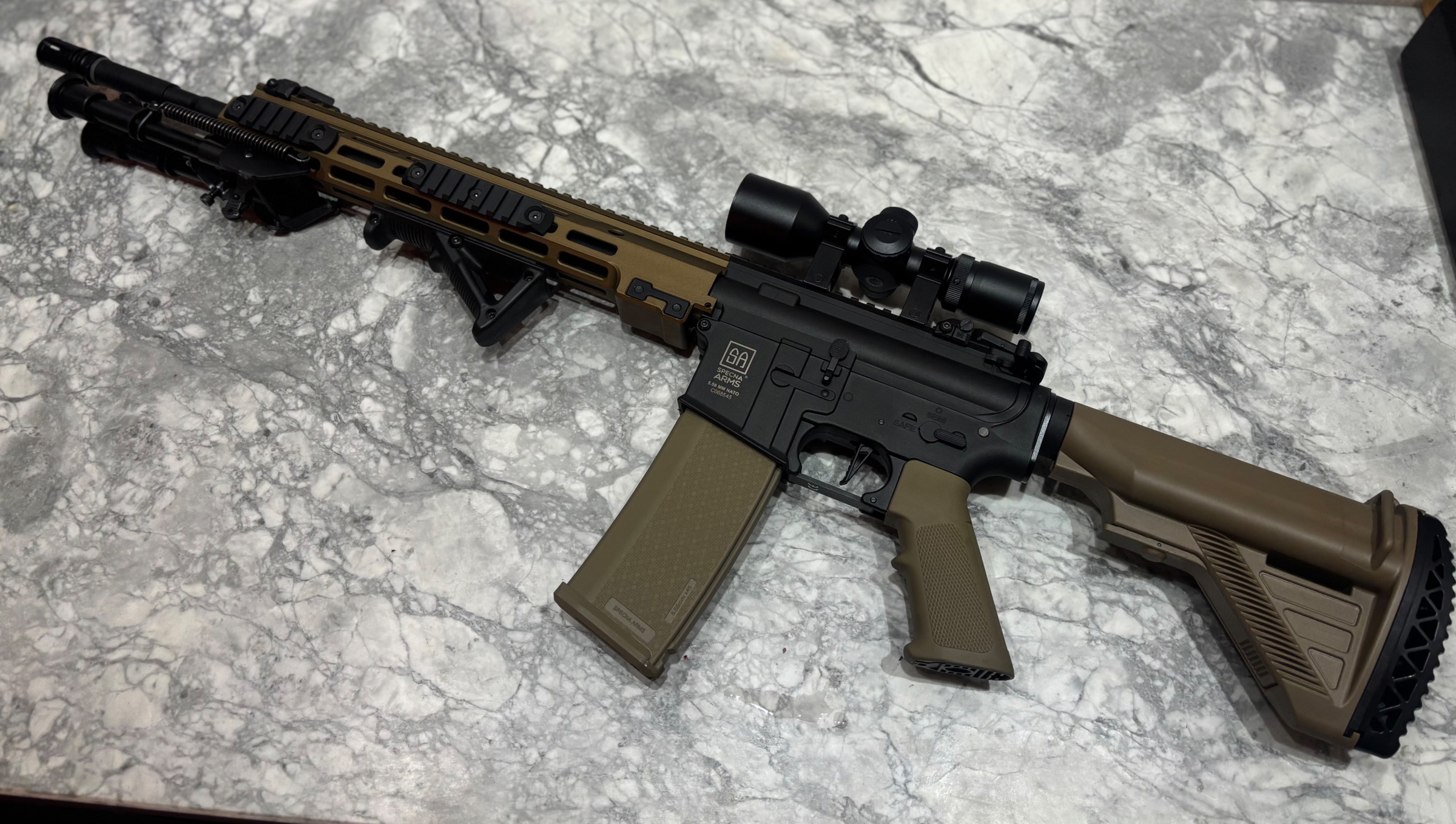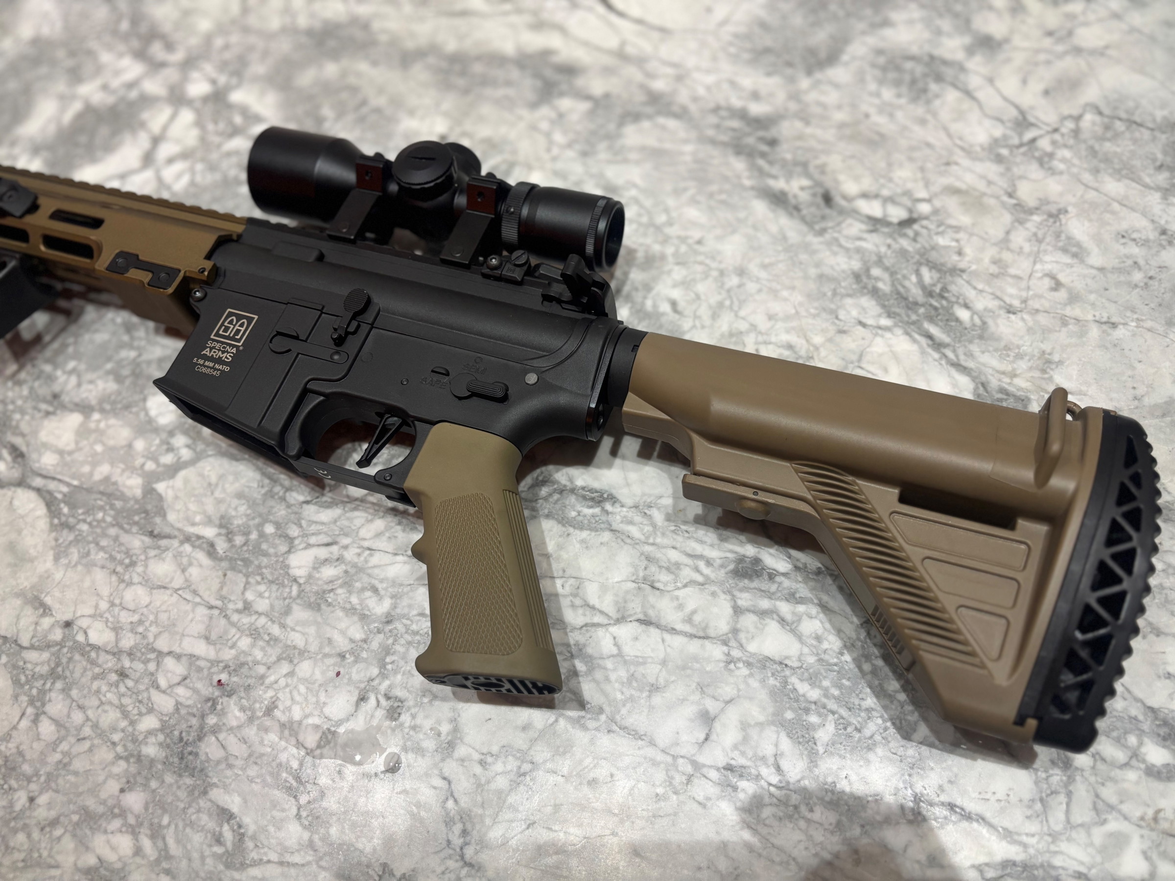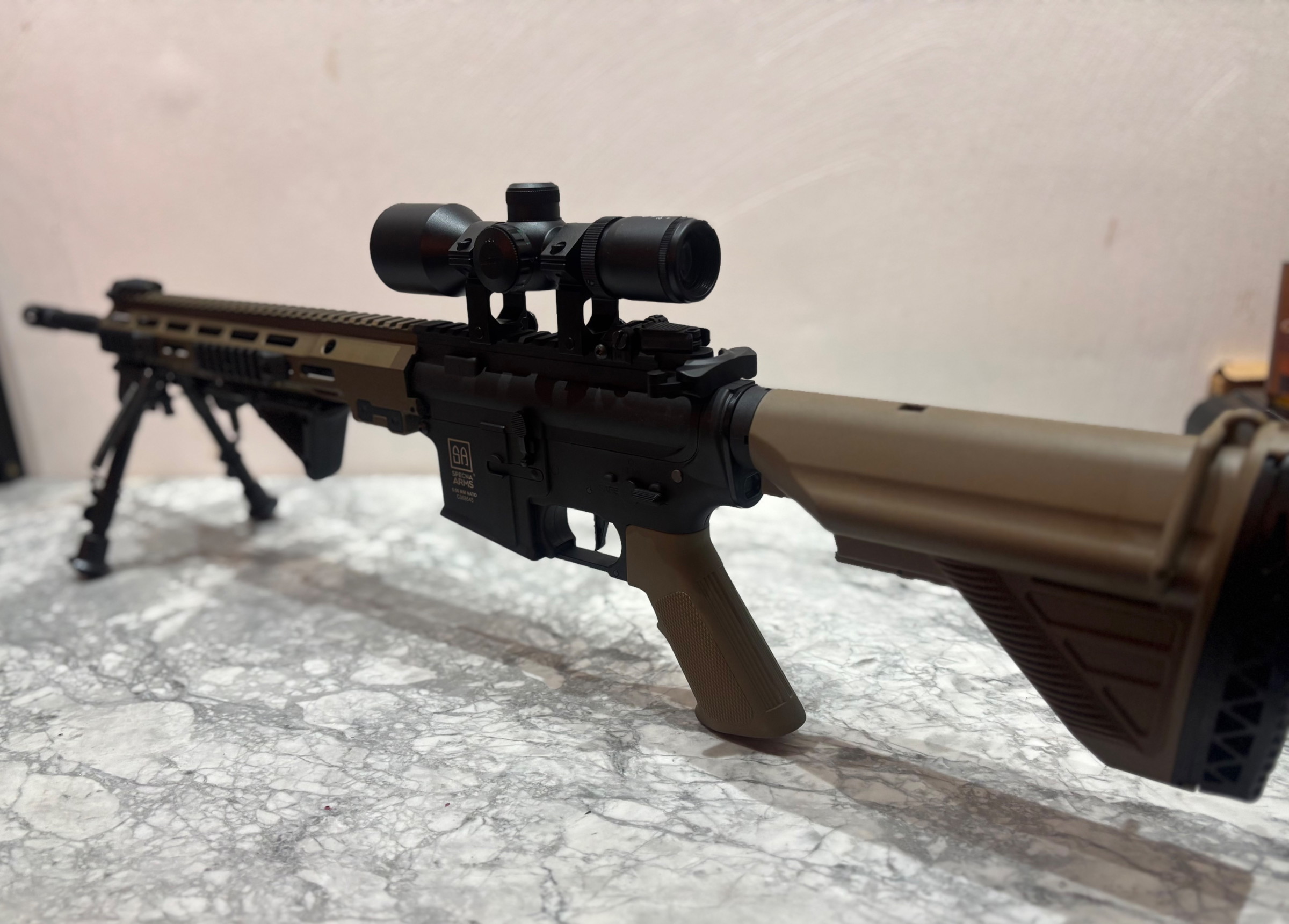Het gaat hier om een nieuwe replica van Specna Arms. Uit de doos, en direct aangepakt en aangepast voor gebruik als DMR. Alle hierbij gebruikte onderdelen zijn ook nieuw.