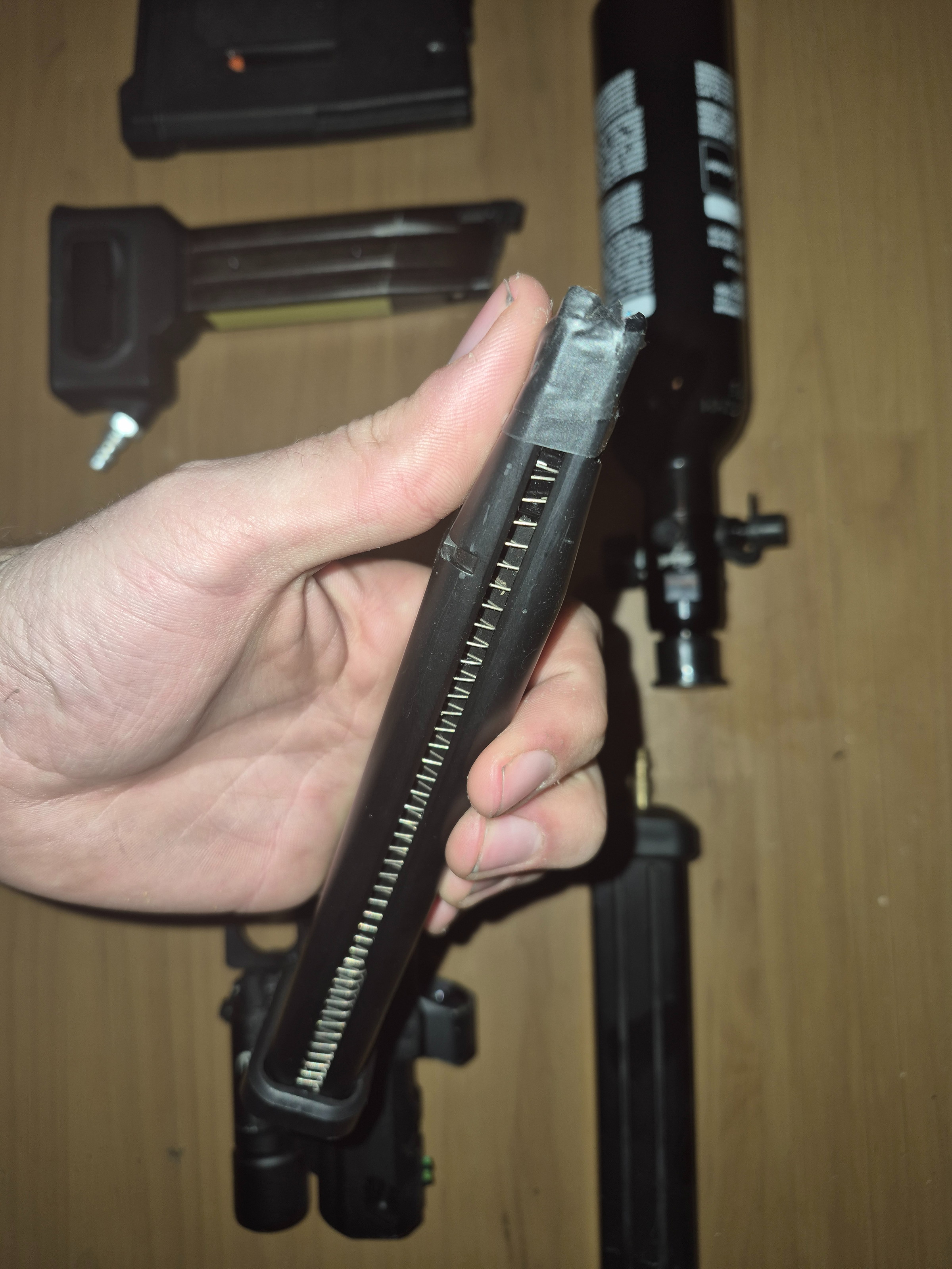 Ik moet deze met pijn aan me hart wegdoen, ik heb er 2 40 round mags bij zitten waarvan in 1tje beetje aarde waarvoor ik te lui was om schoon te maken. Voor de extender heb ik meer mags. And als het is gewenst heb ik ook een grooteren luchtfles en regulator en slang. (Op een anderen advententie te zien)