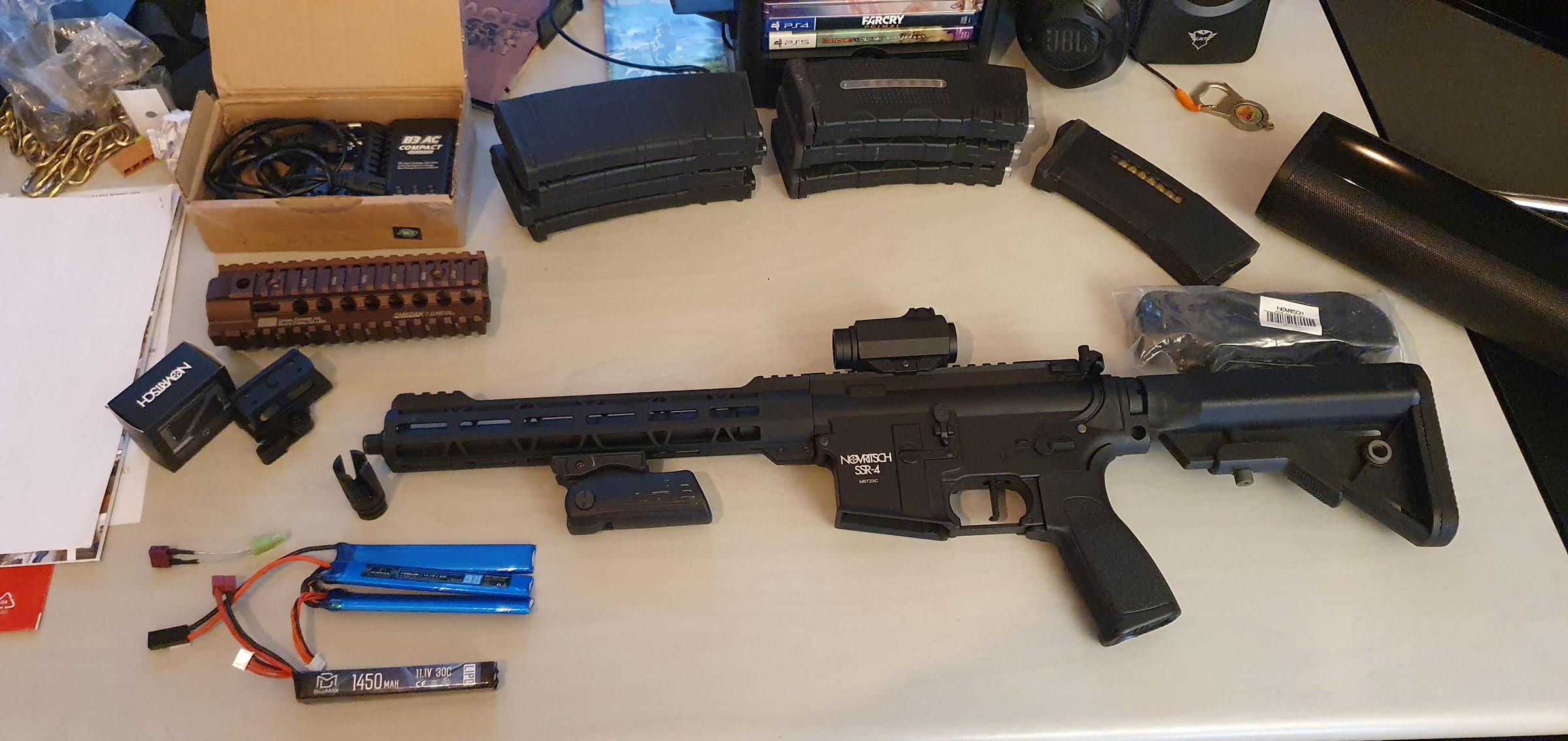 Hierbij verkoop ik een novritsch ssr4 gen 1 omdat deze mij te groot is voor wat ik speel. Er zitten 3 battleaxe mid-caps bij van 150 rounds, 4 s&t mid-caps van 140 rounds, een novritsch qd sling, 2 batterij opldaders (deze zijn recent apart verkocht geweest), een novritsch medium en een high riser voor de red dot v3 die er ook bij komt met kill flash, foregrip, 1nimrod batterij: 1300 mAh/ 11.1v/ 25c ( tamiya) + adapter kabel naar deans voor de replica, 1 bluemax batterij, 1450 mAh/ 11.1v/ 30c (deans), en een daniel defense omega x 7.0 handguard. Indien vragen stel ze gerust er word niks verstuurt , enkel ophalen en cash betalen zo is het fair voor beide.