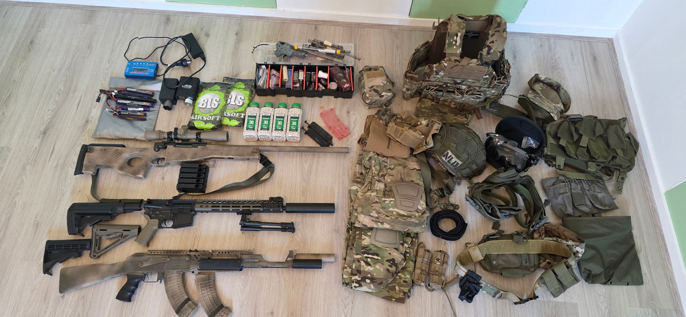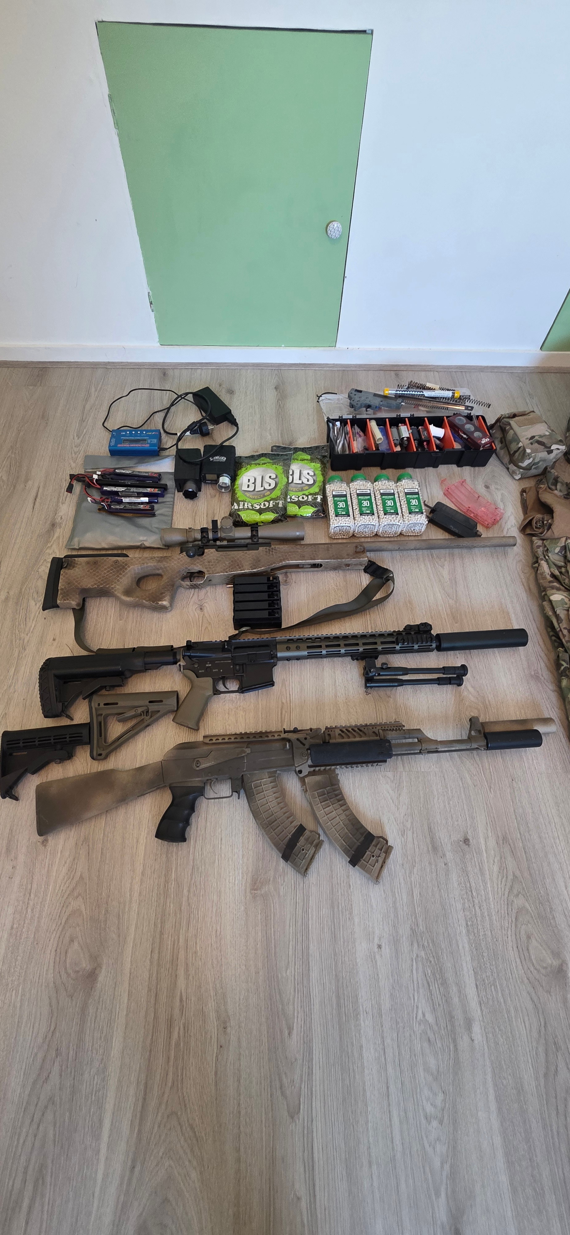 - Specna Arms m4, geen idee welk type. Body is ooit een deel van gebroken en gerepareerd met JBweld, is volledig werkend verder.