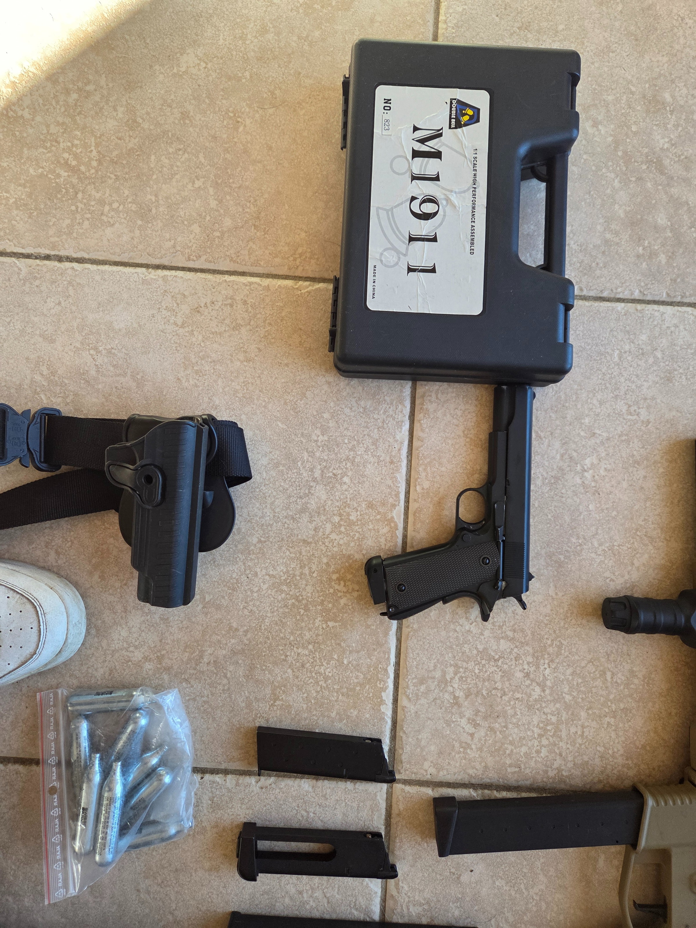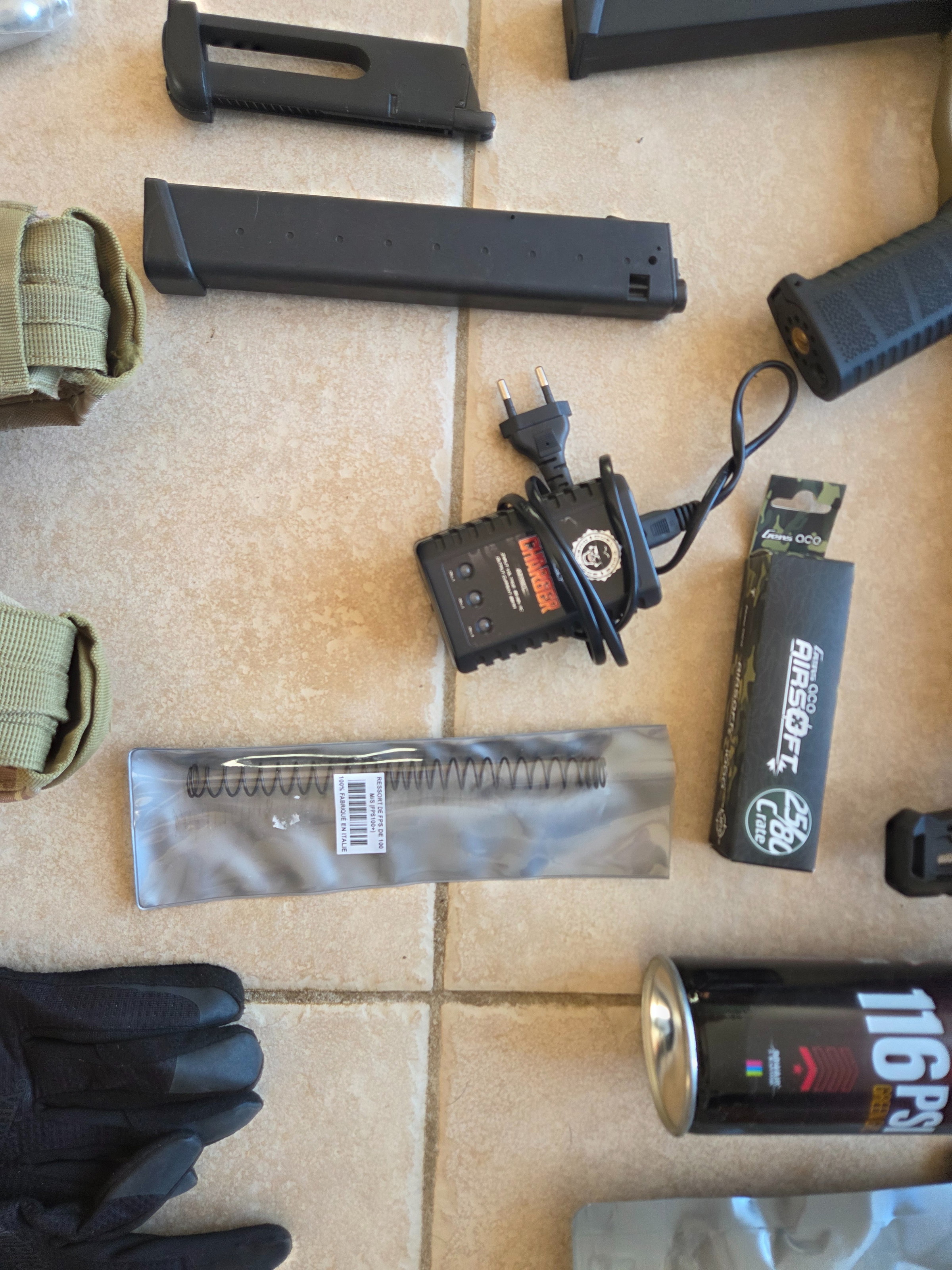 Bonjour, je vends tout mon équipement d'airsoft. Le pack se compose d'une réplique principale AEG Lancer Tactical LT35 génération 2 et d'une réplique de poing 1911 avec des chargeurs à gaz et des chargeurs avec des cartouches de CO2. Ensuite, en équipement, la réplique de base est équipée d'un chargeur à point rouge et d'une poignée avant. J'ai aussi un ressort plus long pour plus de puissance et un chargeur de rechange. Pour la réplique de poing, j'ai trois chargeurs, deux a cartouche de CO2 et un chargeur à gaz. Et j'ai un chargeur en plus pour la réplique de base. Il y a aussi le gilet pare-balles, le holster, deux sacs de billes pleins, une bonbonne de gaz, la housse pour ranger tout l'équipement, des gants et quelques cartouches de co2. Je vends tout car je n'ai plus le temps de pratiquer !