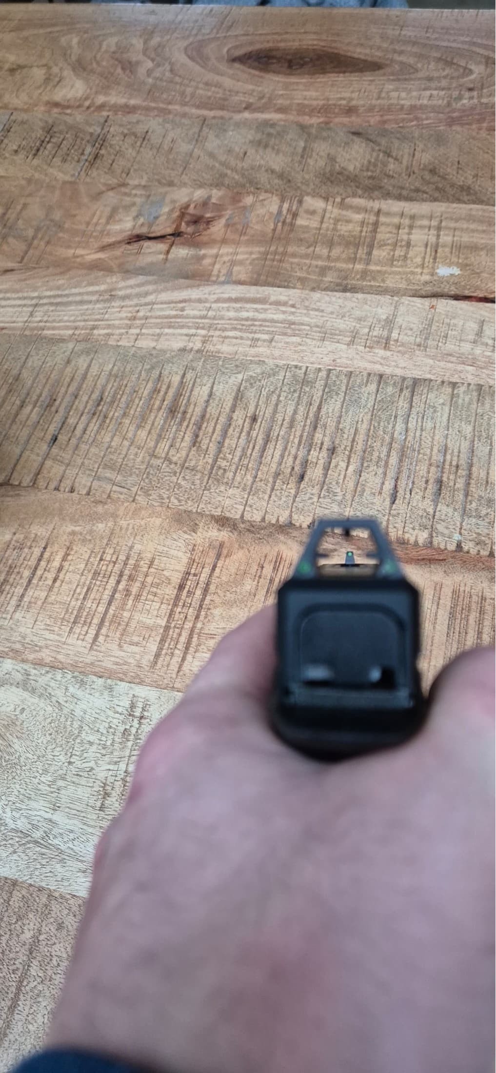 Zowel op de voorzijde als aan de achterzijde bevinden zich fibreoptics, de voorste is de standaard Glock optic en aan de achterzijde zit een crosshair optic op voor een bredere richt beeld.