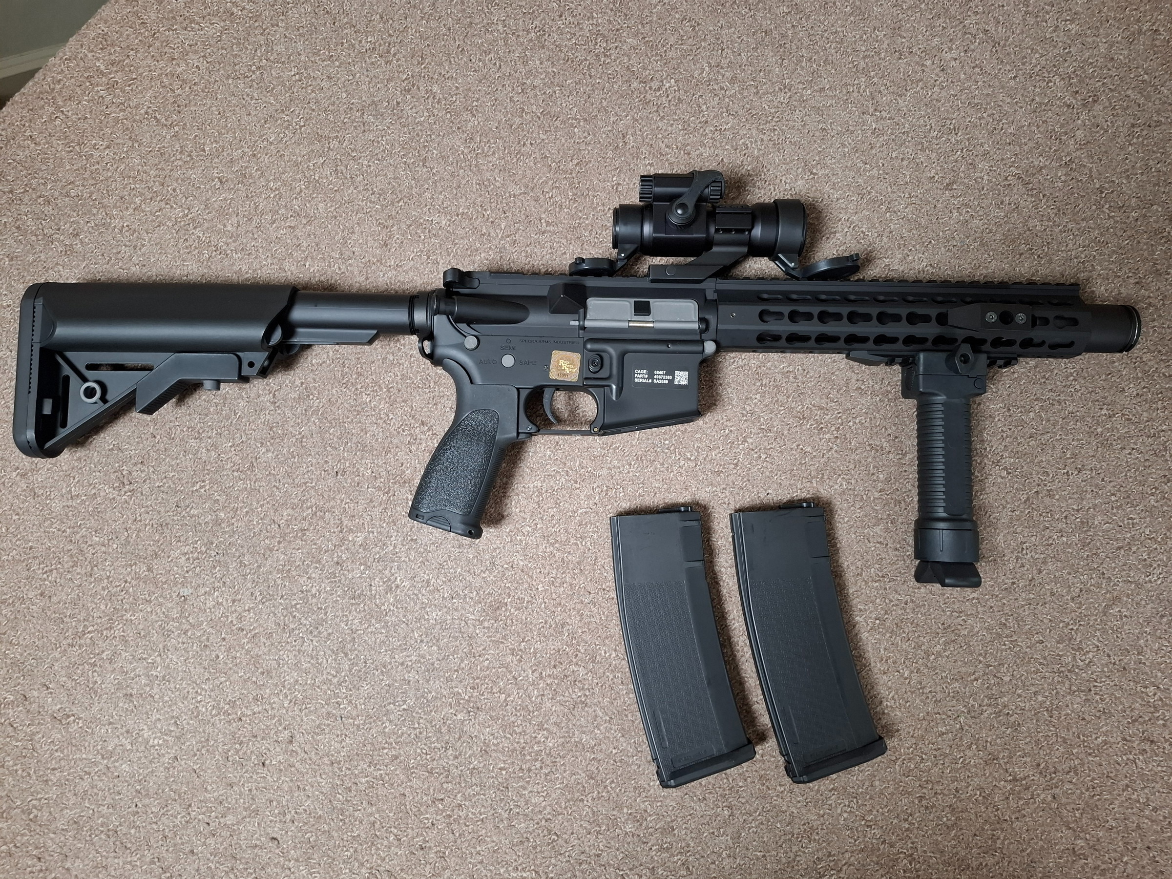 Ik verkoop mijn Specna Arms SA E07 vanwege een beetje opruimen. Hij gloednieuw, en is nog nooit mee geschoten. Er zit een frontgrip en richtkijker op en zijn inbegrepen bij de prijs. Ook de twee magazijnen zijn erbij inbegrepen.