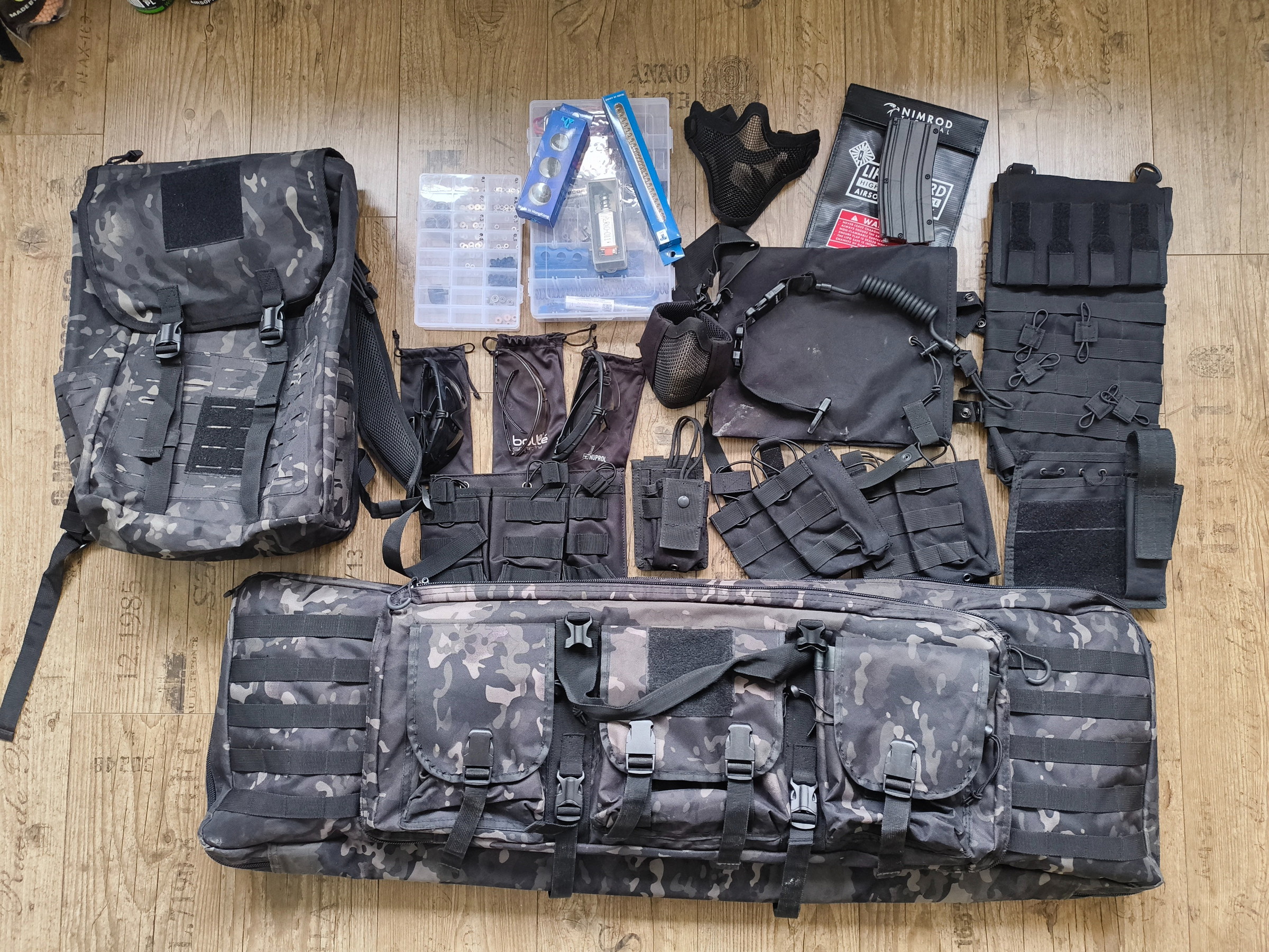 Bag set in night camo and various other pouches/safety glasses/masks/parts. See photo for details.