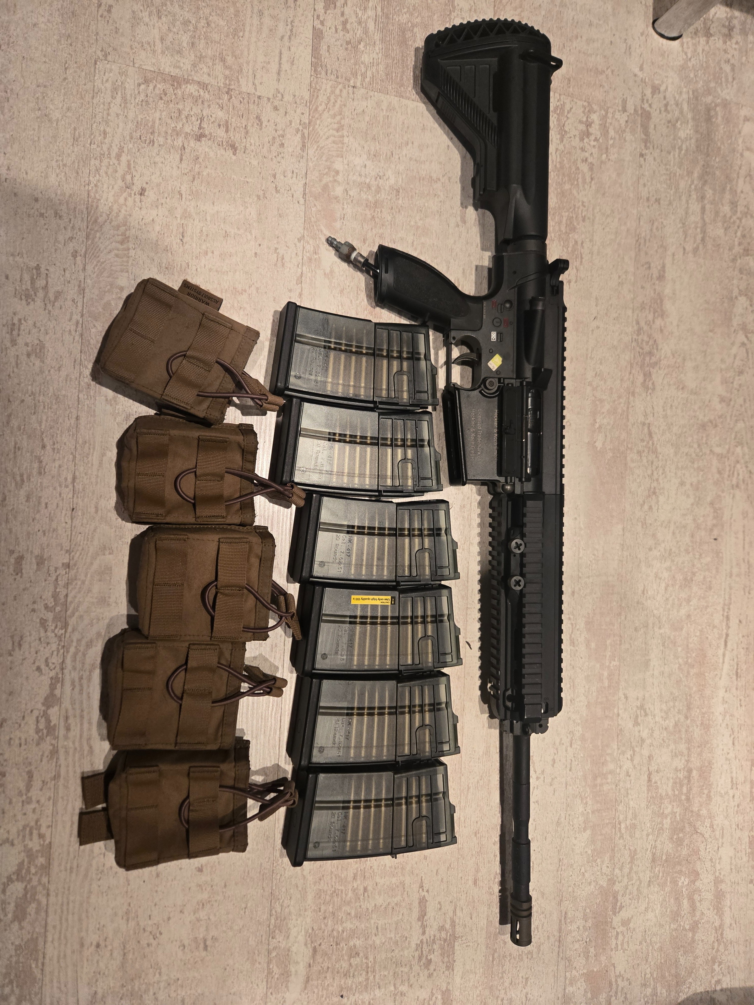 De replica komt met 6 midcaps en 5 tan warrior mag pouches.