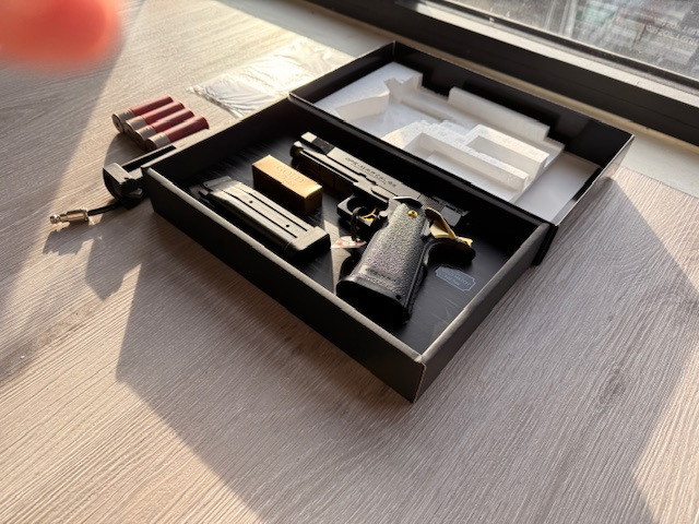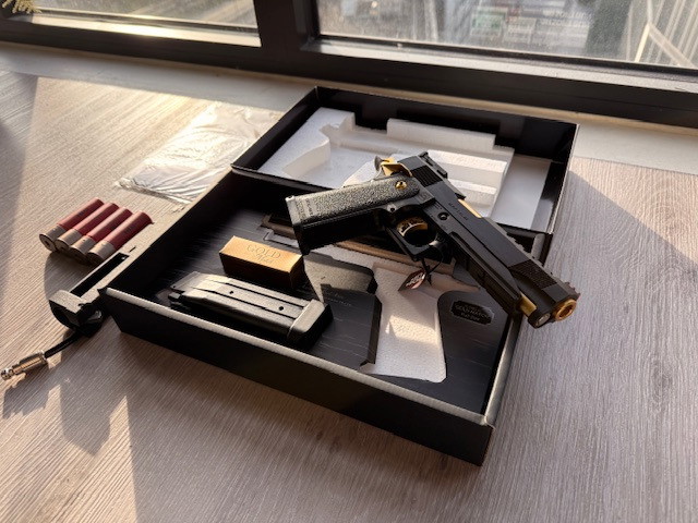 Zo goed als nieuwe Tokyo Marui Hi-Capa 5.1 Gold Match met de Airtac Hi-Capa shotgun shell adapter. Twee keer naar het NAC meegenomen om te testen, maar nog nooit een skirm gezien. Komt met alle onderdelen te zien op de foto.Β