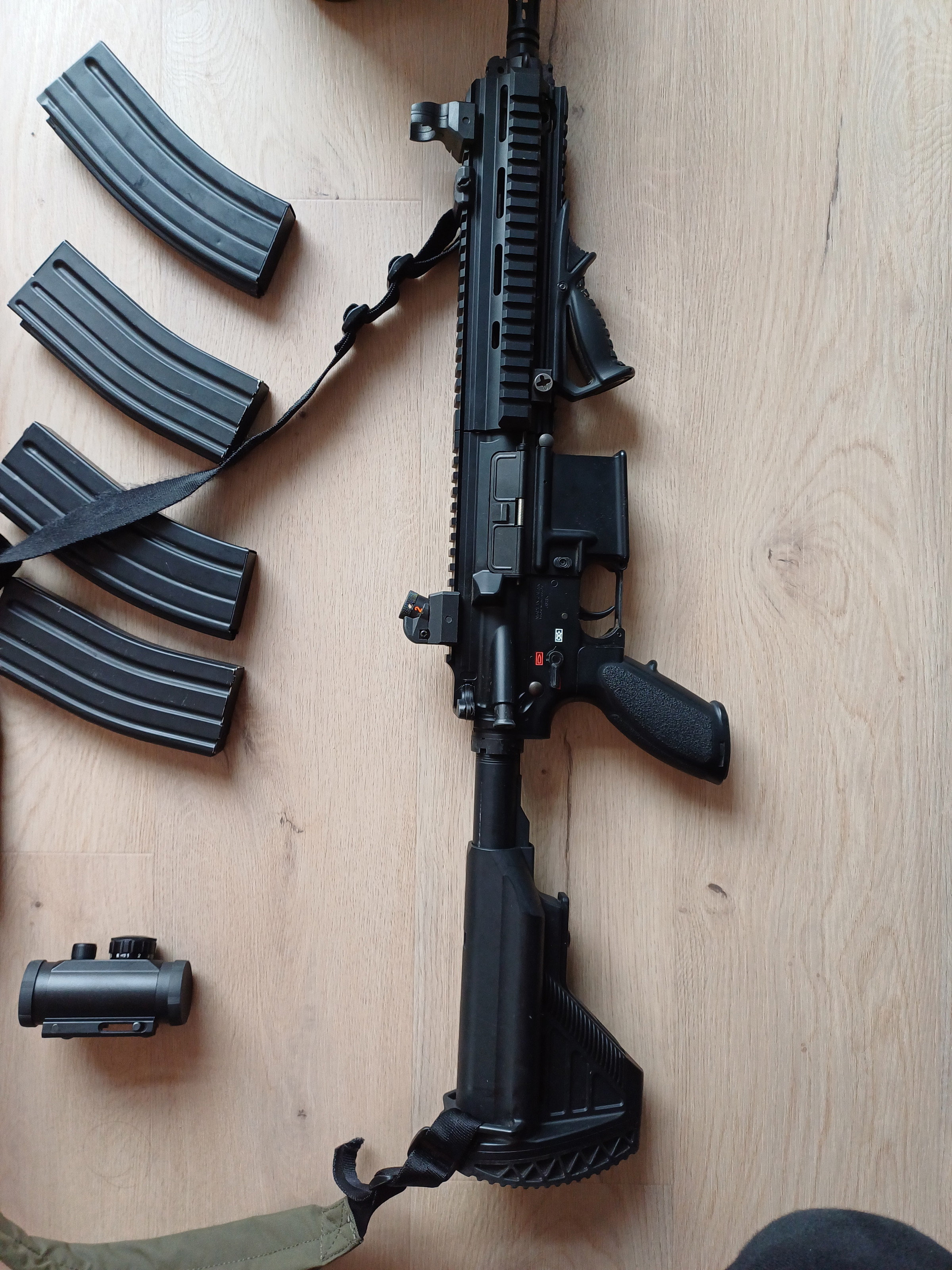 Bij deze verkoop ik mijn TM HK416D Devgru. Voor de kenners: dit is de NGRS-versie. Dat wil zeggen dat hij een lichte terugslag (recoil) heeft en stopt met schieten zodra je magazijn leeg is. Zeer betrouwbaar toestel dat technisch nog volledig standaard staat.