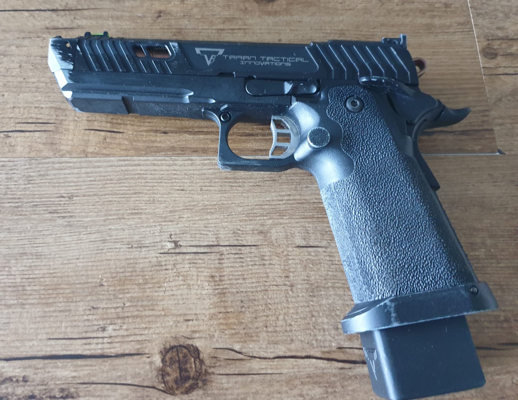 • Deze replica is een officiële samenwerking tussen EMG en Taran Tactical Innovations, bekend van hun custom race pistolen. Het ontwerp komt rechtstreeks uit John Wick 4, compleet met de kenmerkende 120mm lange outer barrel en compensator. Het Hi-Capa platform betekent dat je toegang hebt tot een enorm aftermarket aan upgrade-onderdelen.