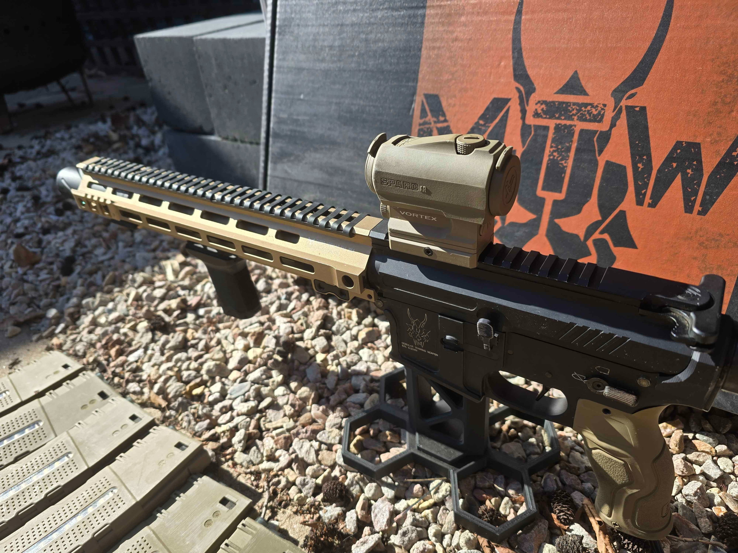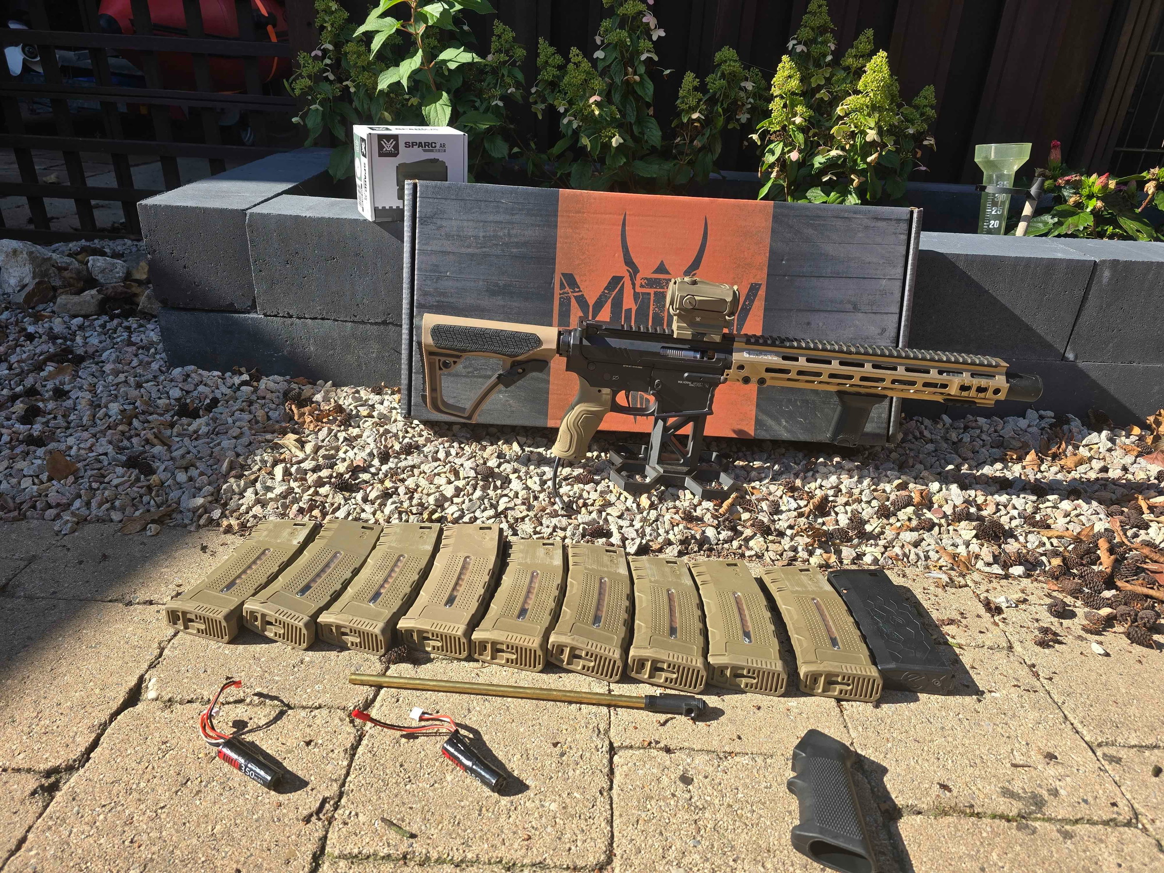 Hierbij bied ik mijn geupgrade MTW billet 10 inch met 13 inch rail aan. Met deze kanon van een replica speel je elke speler van het veld. Doordat er een Gorilla FCU in zit kan je deze met bluetooth programmeren naar eigen smaak en speelstijl. Doordat de replica ook is voorzien van een PDI innerbarel in combinatie met een Phoenix hopup schiet deze belachelijk ver en strak.
