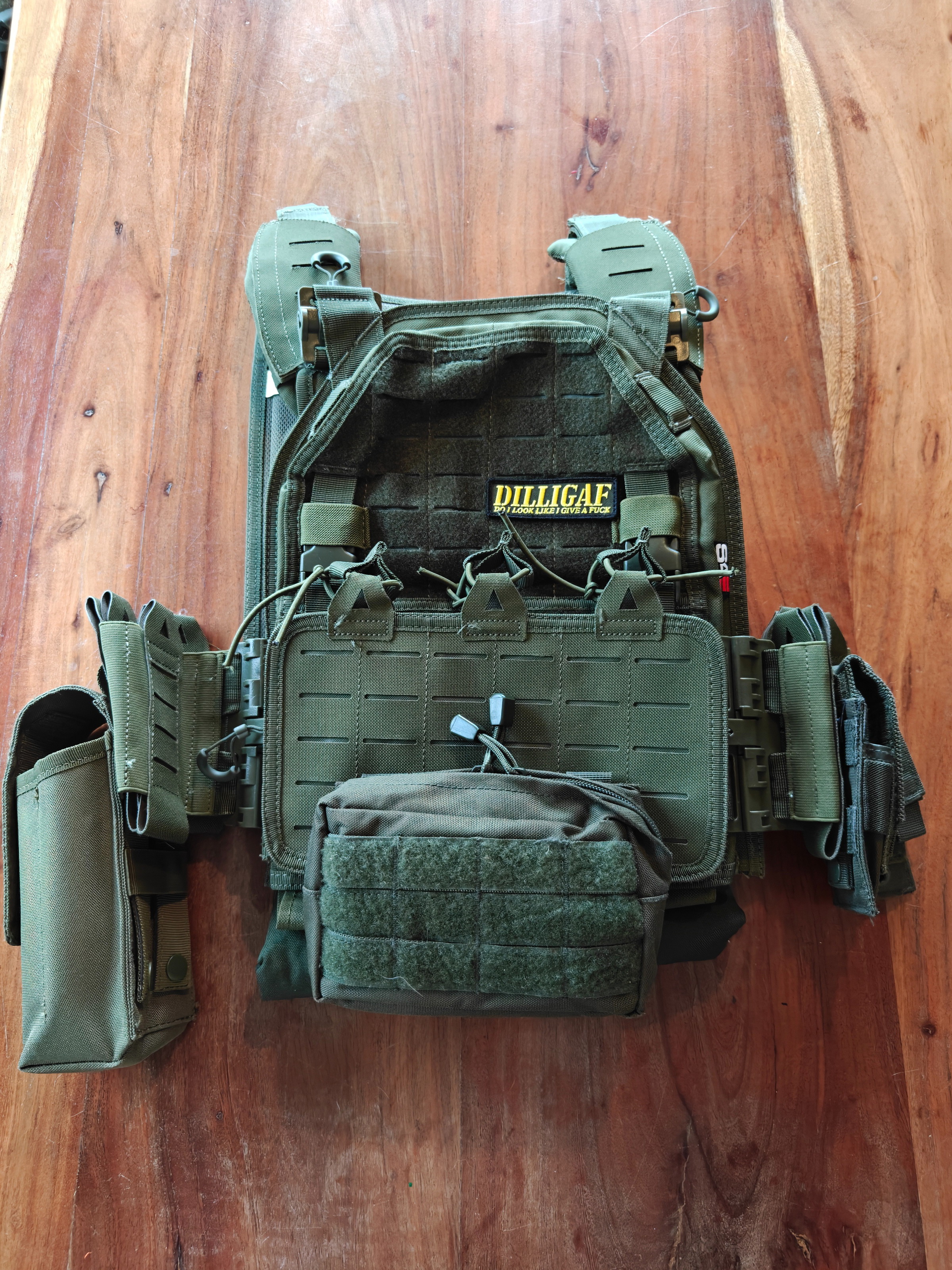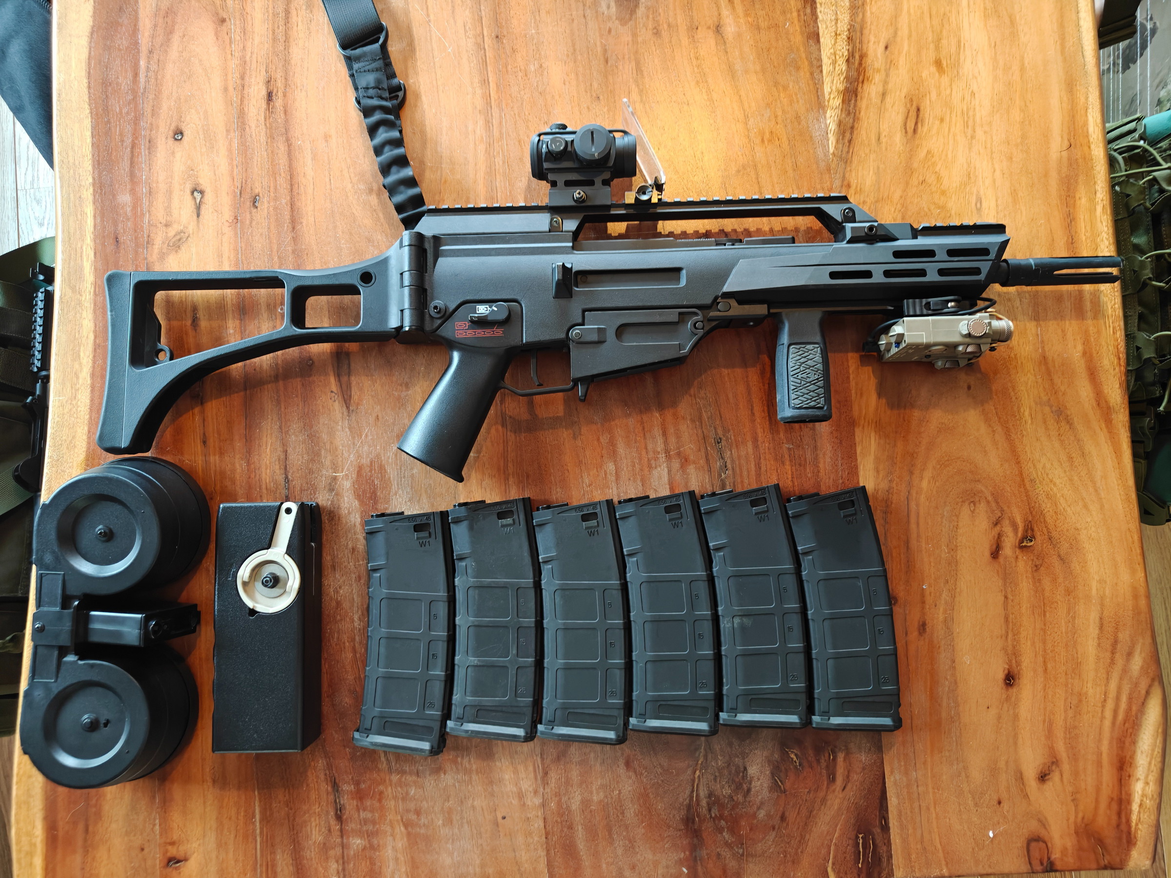 Bestaande uit 3 rigs (zwaar, middel, minimaal) en 5 replika's (RK74T zgan in de doos, LCT AKU zgan, Novritsch G36C korte barrel en normale licht gebruikt, Umarex MP7 defect, sig Sauer M18 defect, met allen extra mags. Daarnaast nog een hele rits aan pouches, batterijen, onderdelen, veren etc. Bij alle replika's behalve de M18 zitten de dozen. Extra foto's mogelijk.