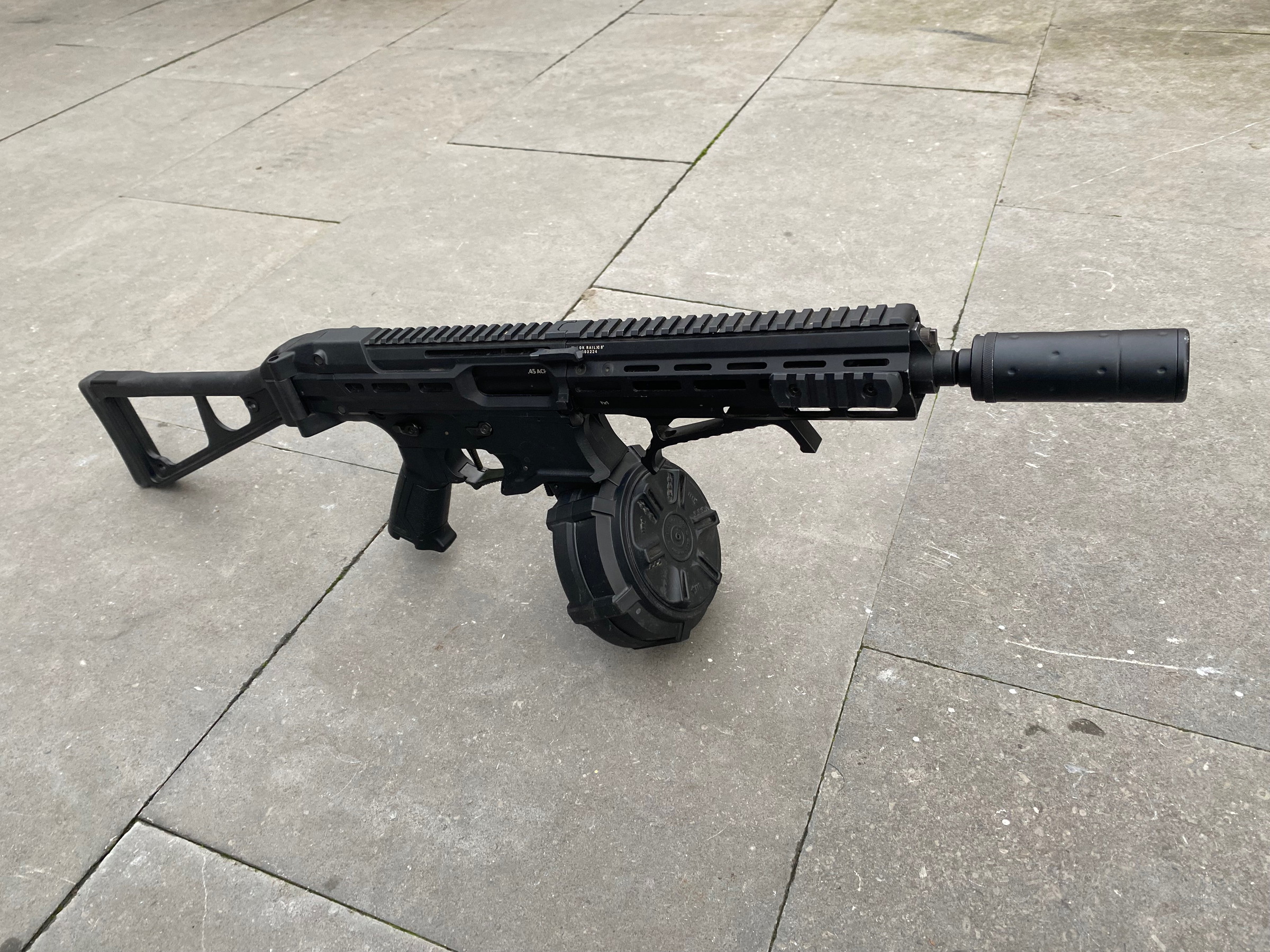 De Pcc45 van G&G is iets minder geupgrade, maar schiet erg goed. Deze heeft een madbull barrel en een andere veer. Ook deze replica heeft de optie om de veer te vervangen zonder de replica uit elkaar te halen. Hij heeft een foldable stock wat hem voor CQB heel fijn maakt. Deze komt met een extra geprint onderdeel waardoor je de stock zou kunnen vervangen voor eentje die je zelf mooi vind mocht je dat willen. Deze replica komt met 3 normale magazijnen en een drum mag. Er zit een novritsch silencer op, voor zowel de sier als om de barrel die uitsteekt te beschermen. Ook hier zit een grip op.