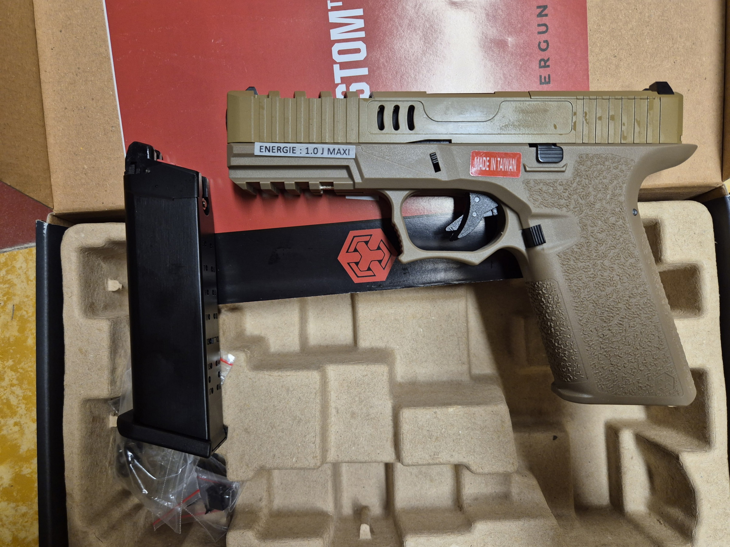 Description: modèle qui reprend la forme d'un Glock, totalement customisé et repensé par AW Custom avec plaque pour etre un rmr, replique totalement neuve avec son mag d'origine culasse metal tres bon kick