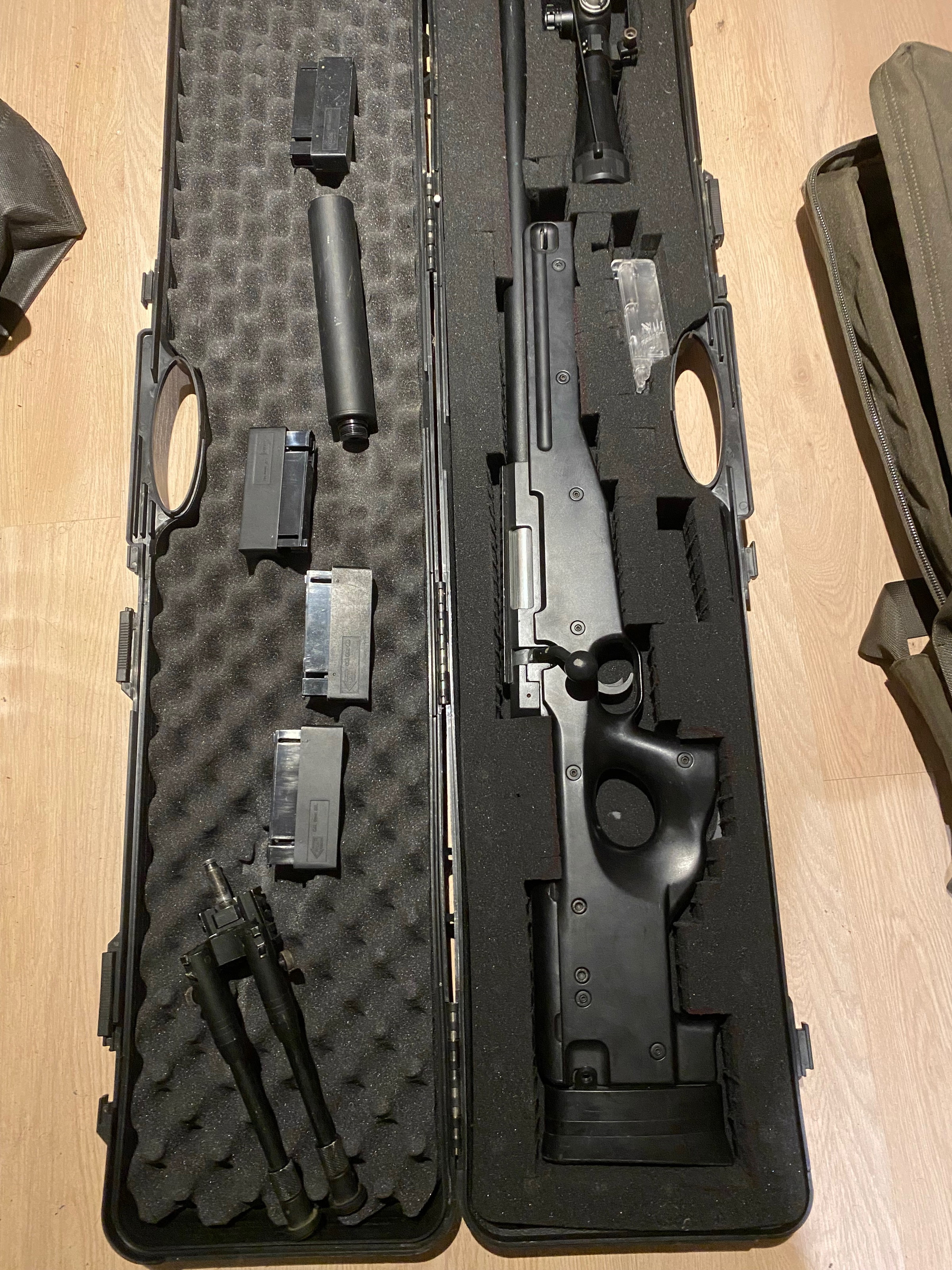 Is een well L96 sniper, met 4 magazijnen, een silencer en in een koffer.