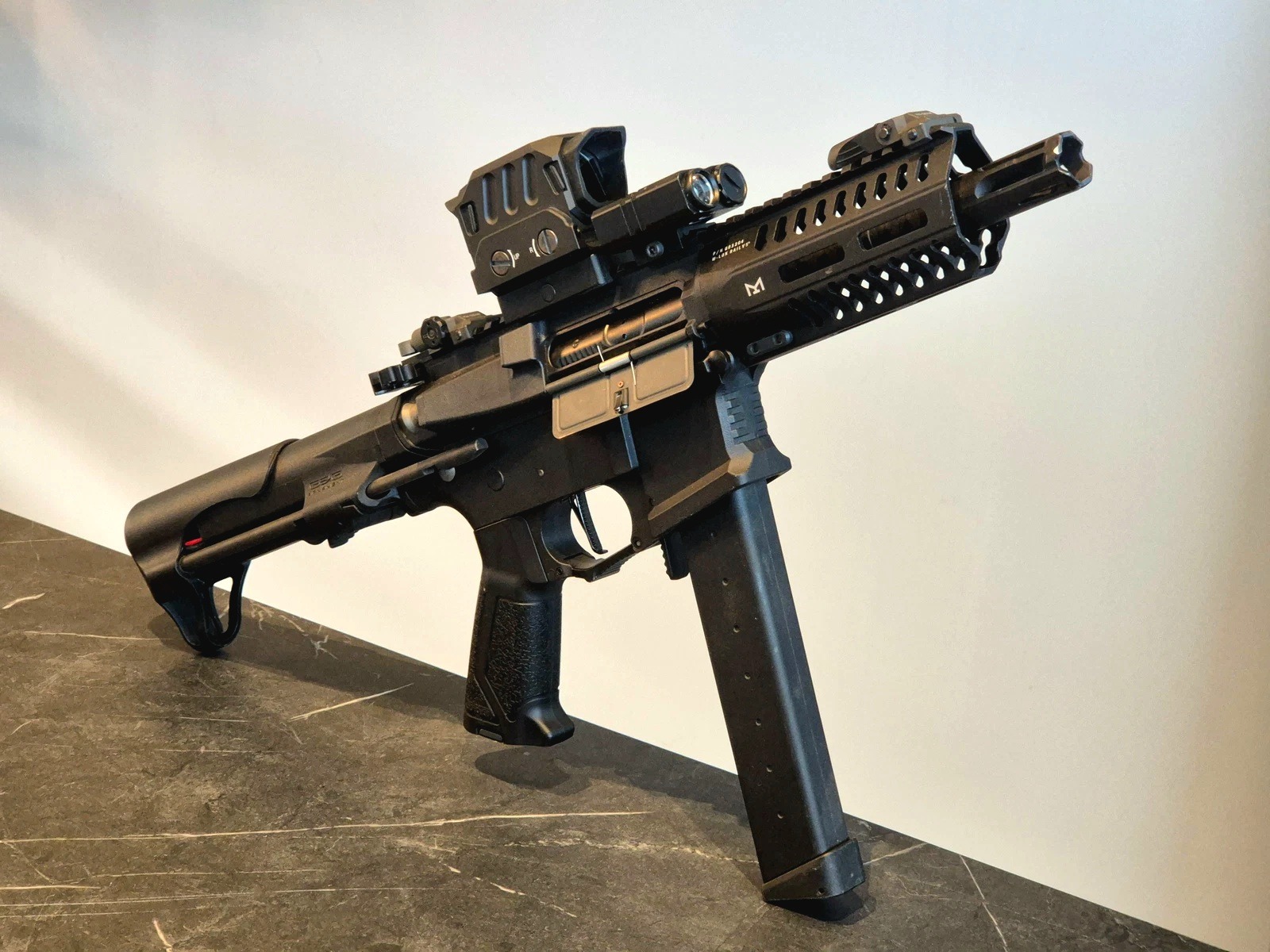 • Duurzame polymeer carbine-receiver in 9 mm-stijl met matte geanodiseerde afwerking en gestempelde G & G-vullingen, bootst de populaire stijl van de pons van receiver na