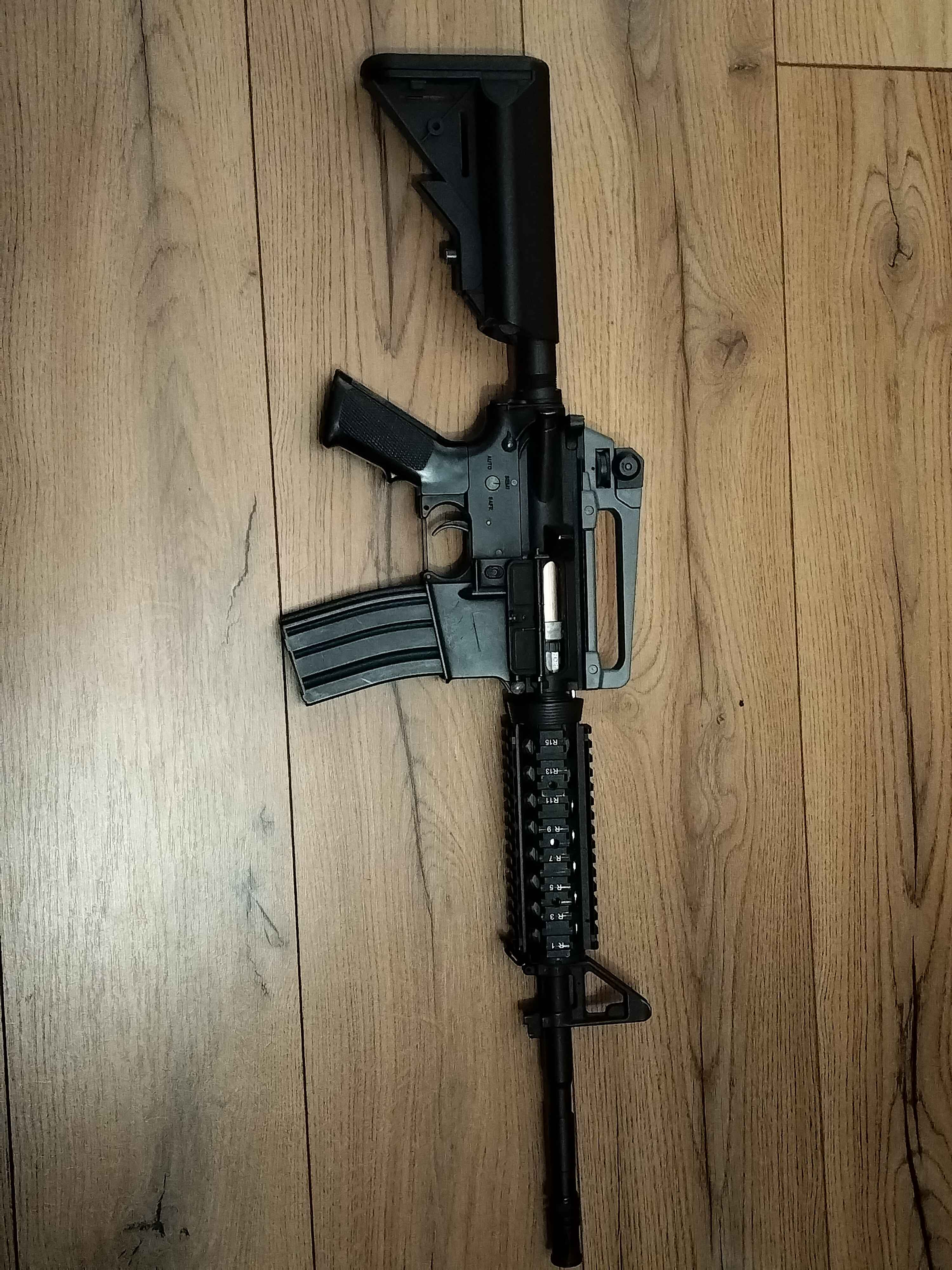 1: metalen m4 met Cyma gearbox. Deze replica is nooit gebruikt op een veld. Heeft thuis als decoratie gestaan. Hij schiet 0.8J