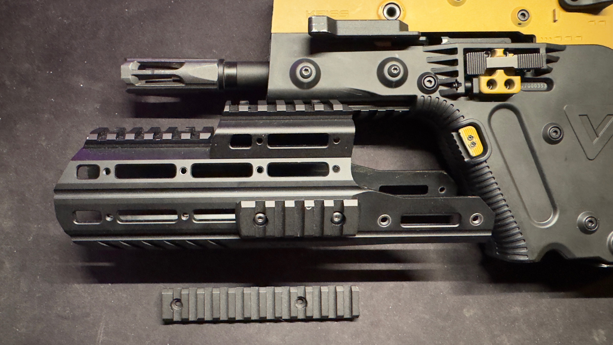 Bij deze te koop aangeboden voor de kriss vector; een gebruikte acetech vik handguard met een beschadigd stuk top rail.
