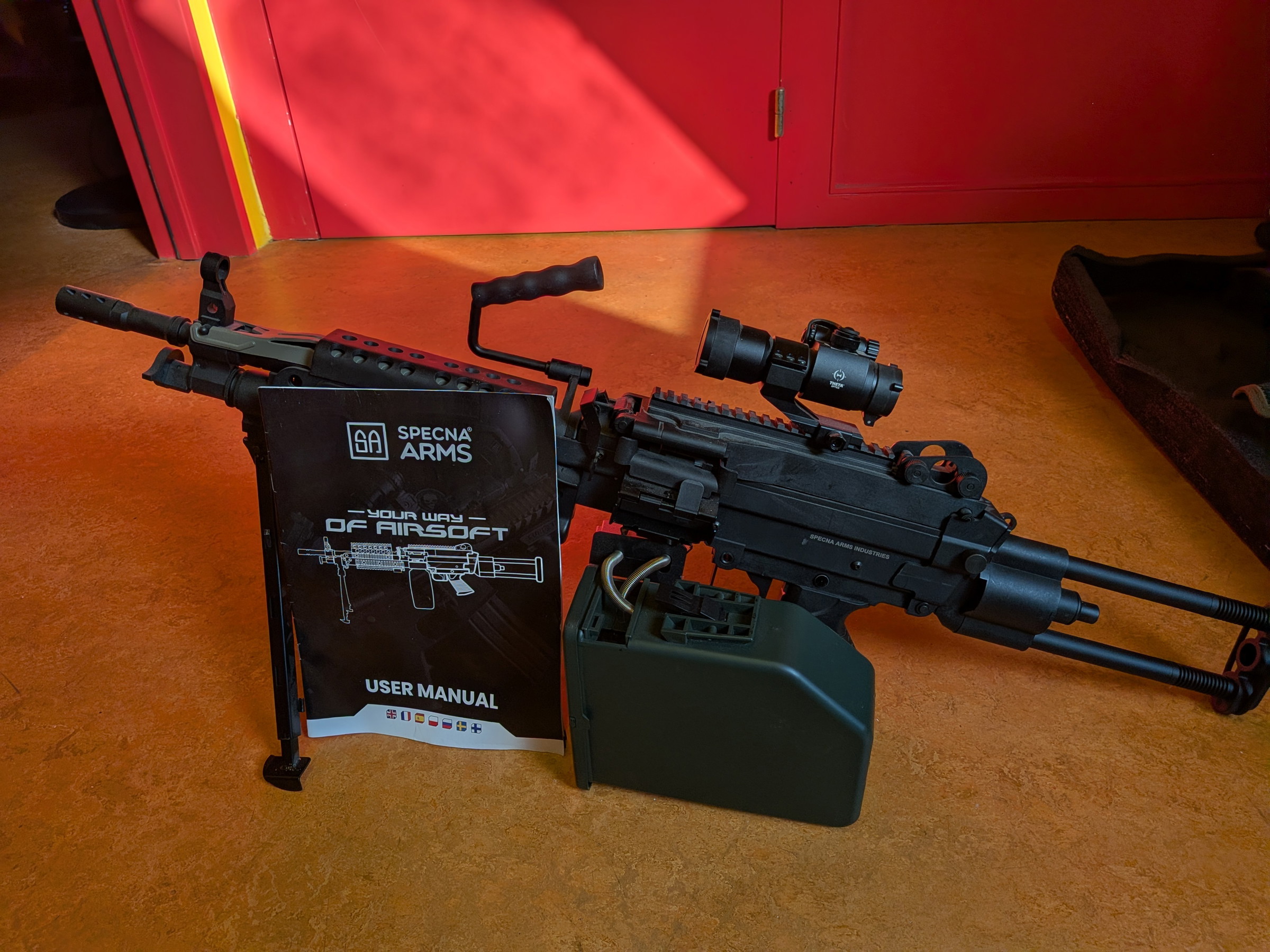 Hierbij verkoop ik mijn specna arms m249 + aimpont met 4x m4 lader, box lader (gevuld), 2x li-po 1600, oplader, 2 zakken mun en facemask.