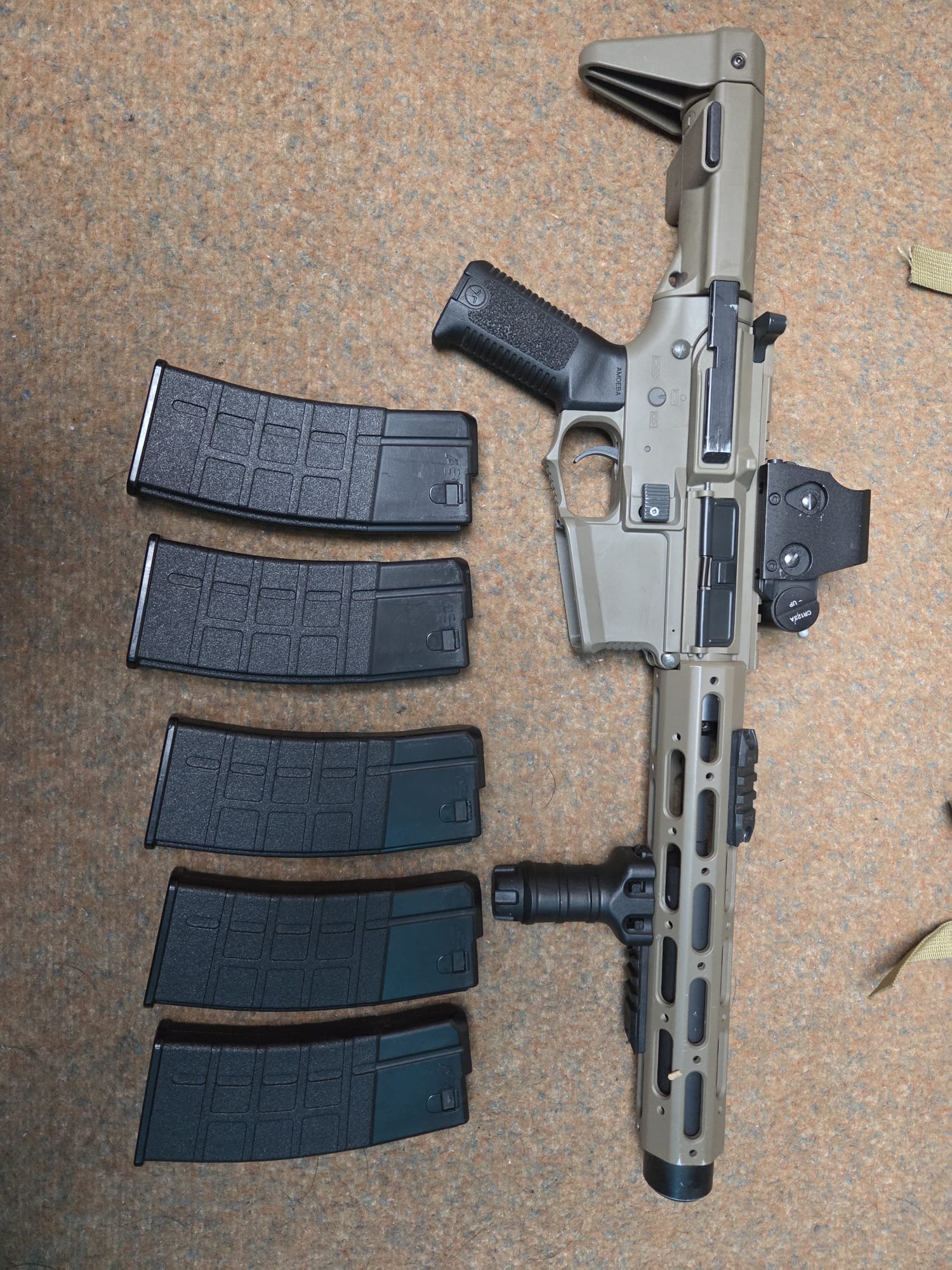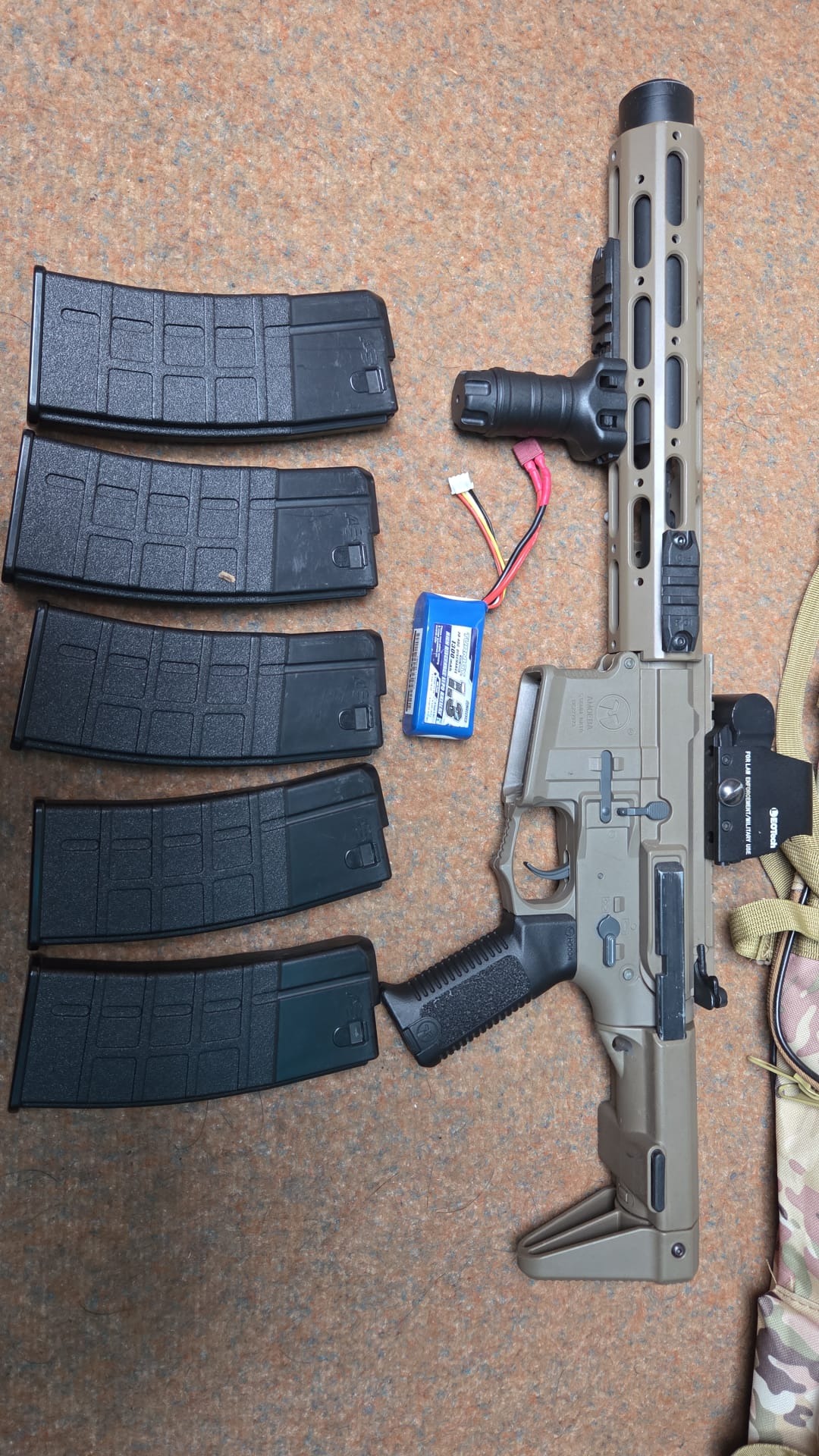 Komt inclusief 11.1V 1300 mAh accu, holo scope en 5 midcaps