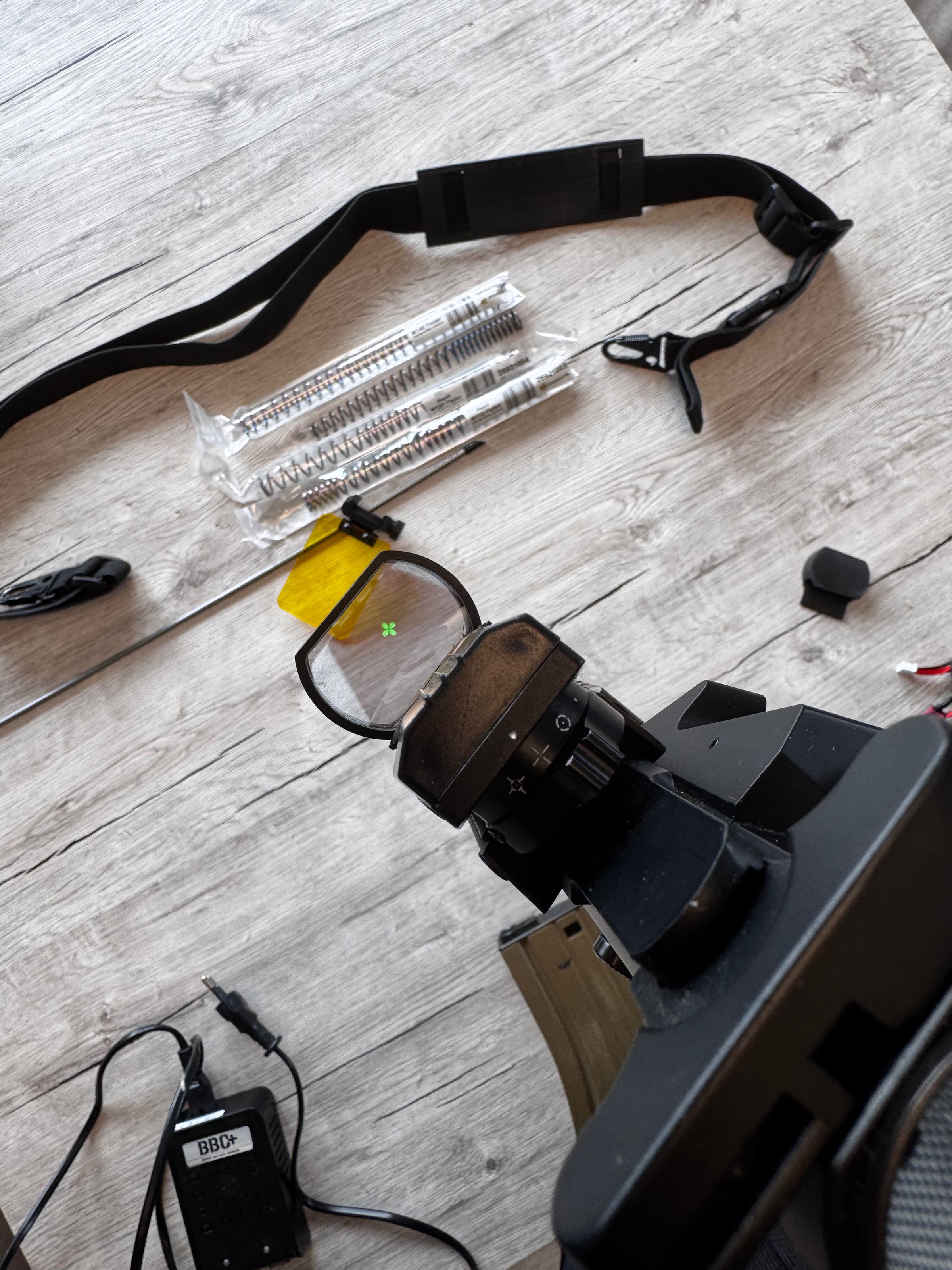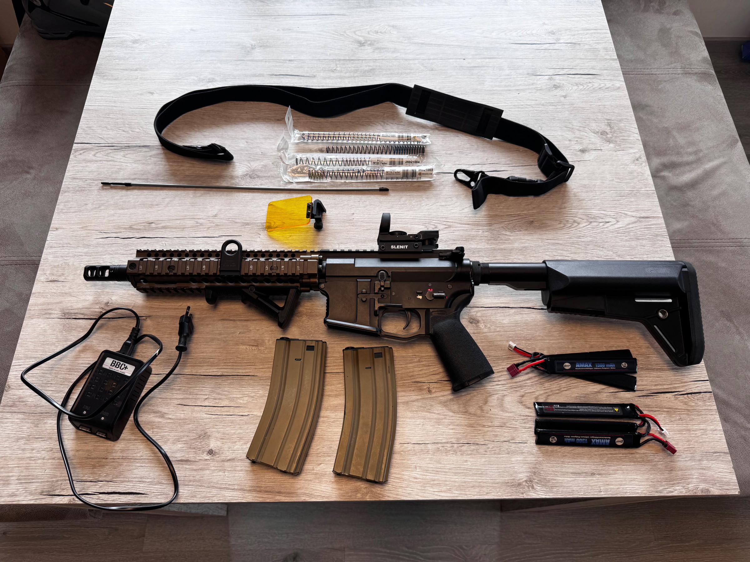 Hallo ich verkaufe hier meine Begadi M4 Nova Generation 5. Mit diversen Anbauteilen ( siehe Fotos ) Die Waffe wurde im Mai 2023 gekauft und dann nur ca 1 Jahr genutzt. Da ich Mitte 2024 mit Motorradfahren angefangen habe. Und seit dem liegt sie Sauber verstaut im Keller.