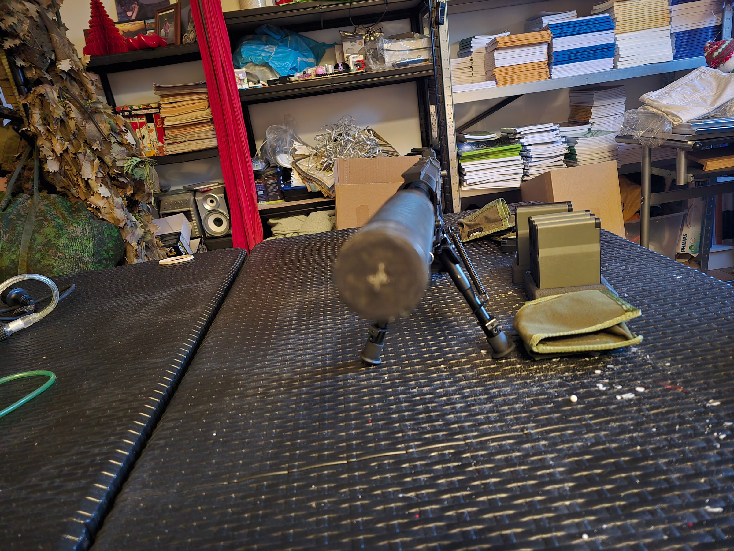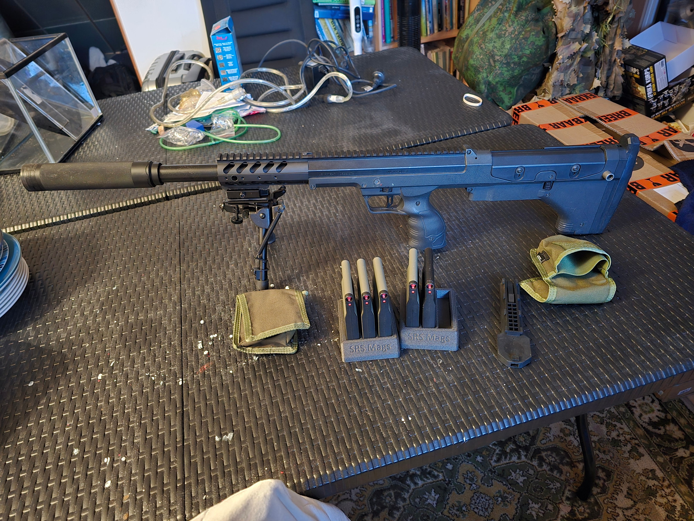 Extras: 5 magazijnen, 1 bipod, 1 Silverback suppressor met fartflap en 2 magazijn pouches