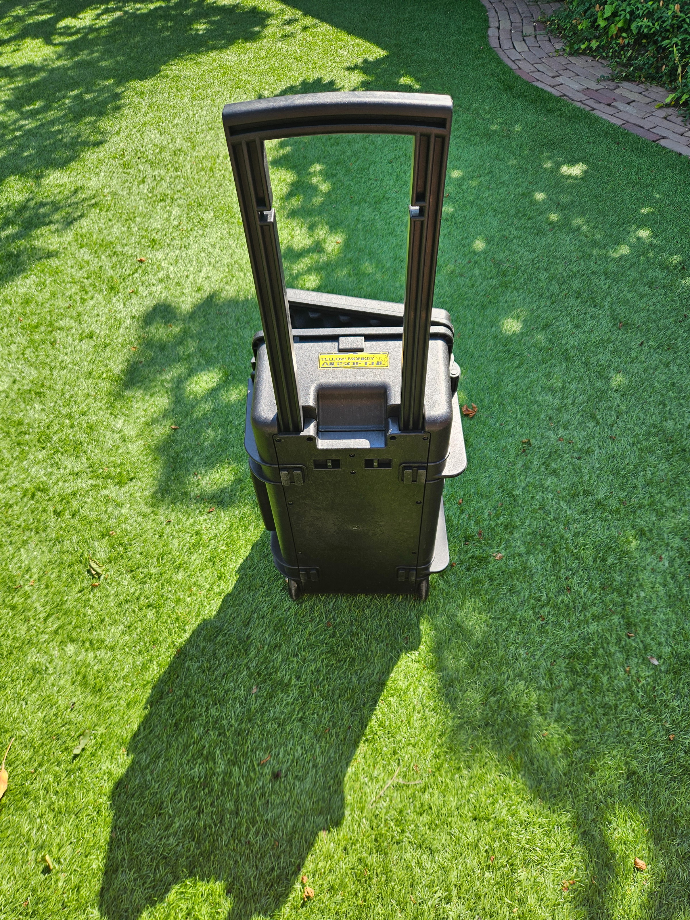 - kan op wielen worden gerold door de uitschuifbare handgreep vast te houden of te dragen