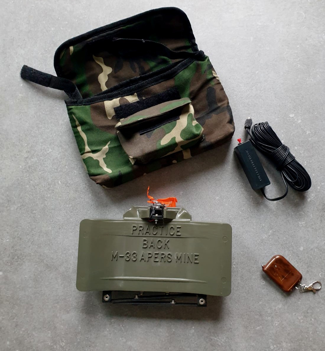 De mijn is naar keuze gevuld met 6 mm airsoftballen en wordt geactiveerd via een stopdraad of een radio-ontvanger (inbegrepen) vanaf een afstand van maximaal 100 meter.