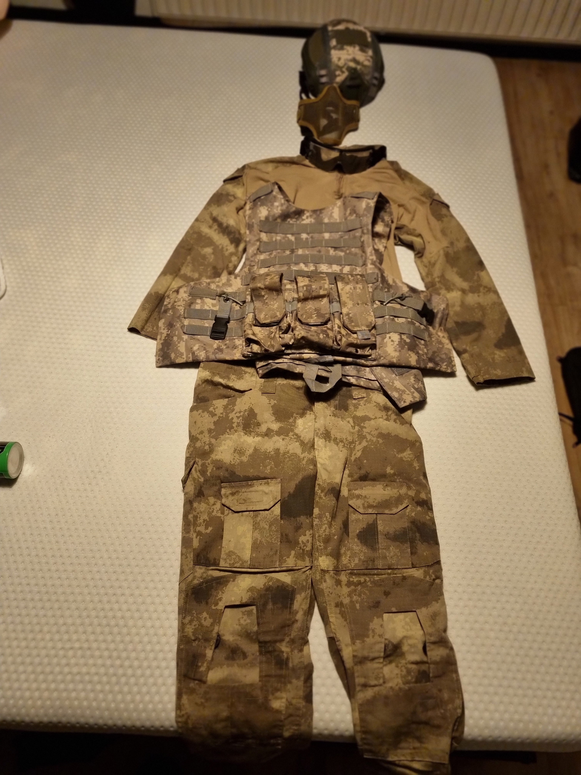 Broek en t-shirt is maat S maar valt groot zit ook een helm bij met tactical vest/ bril en gezichtsmasker/ speed loader en een rugtas waar alles in kan en een wapen tas