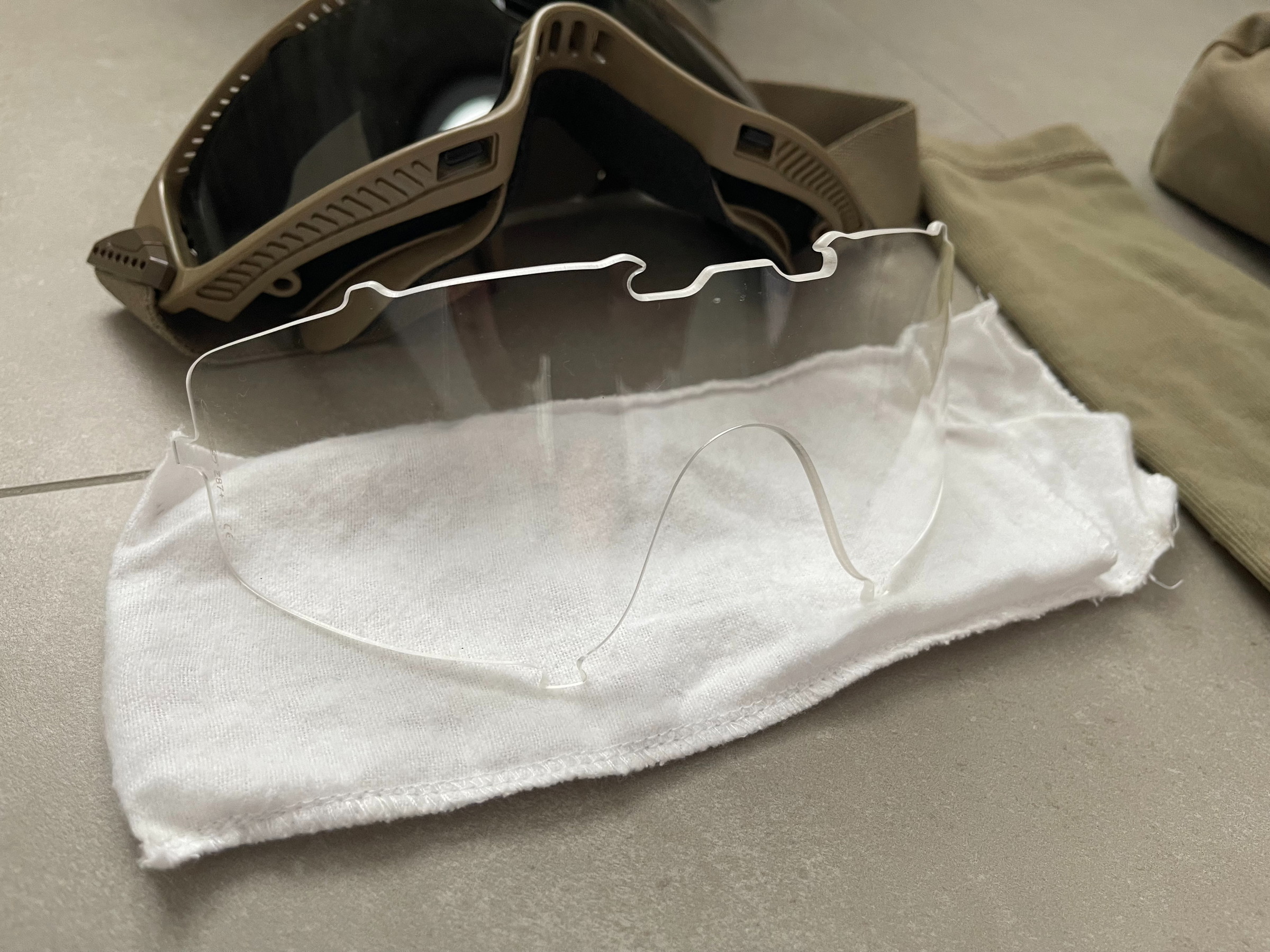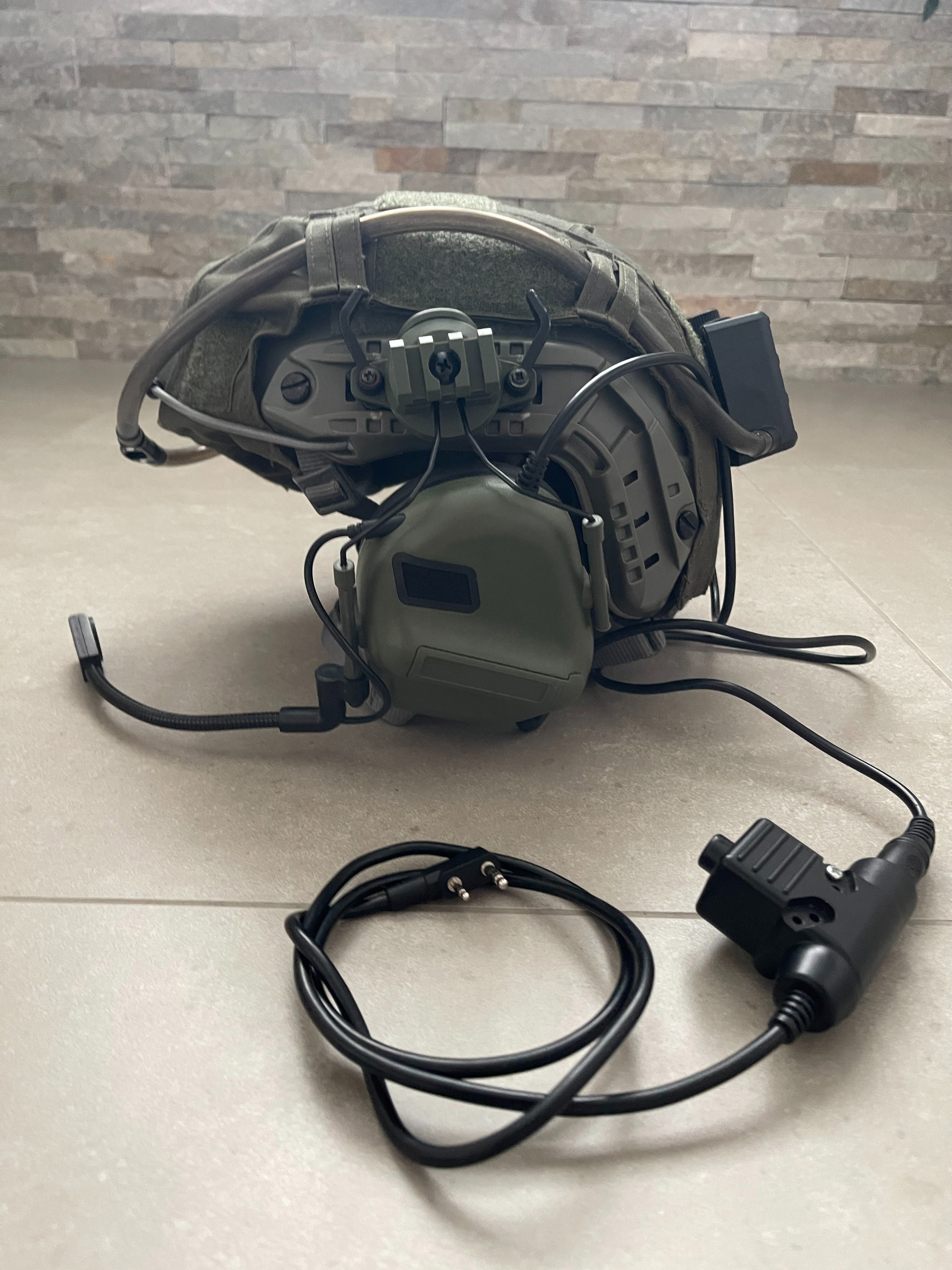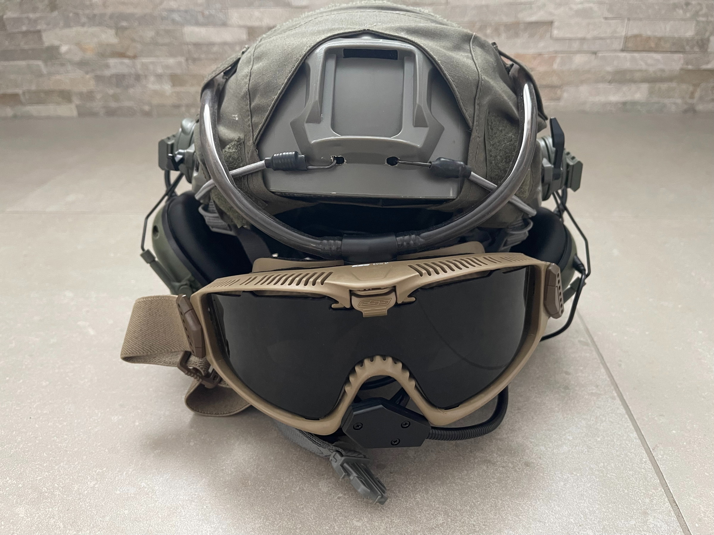Complete set met Helm, headset, microfoon, Novritsch Defog, ESS Influx bril en Porto Baofeng uv-5r