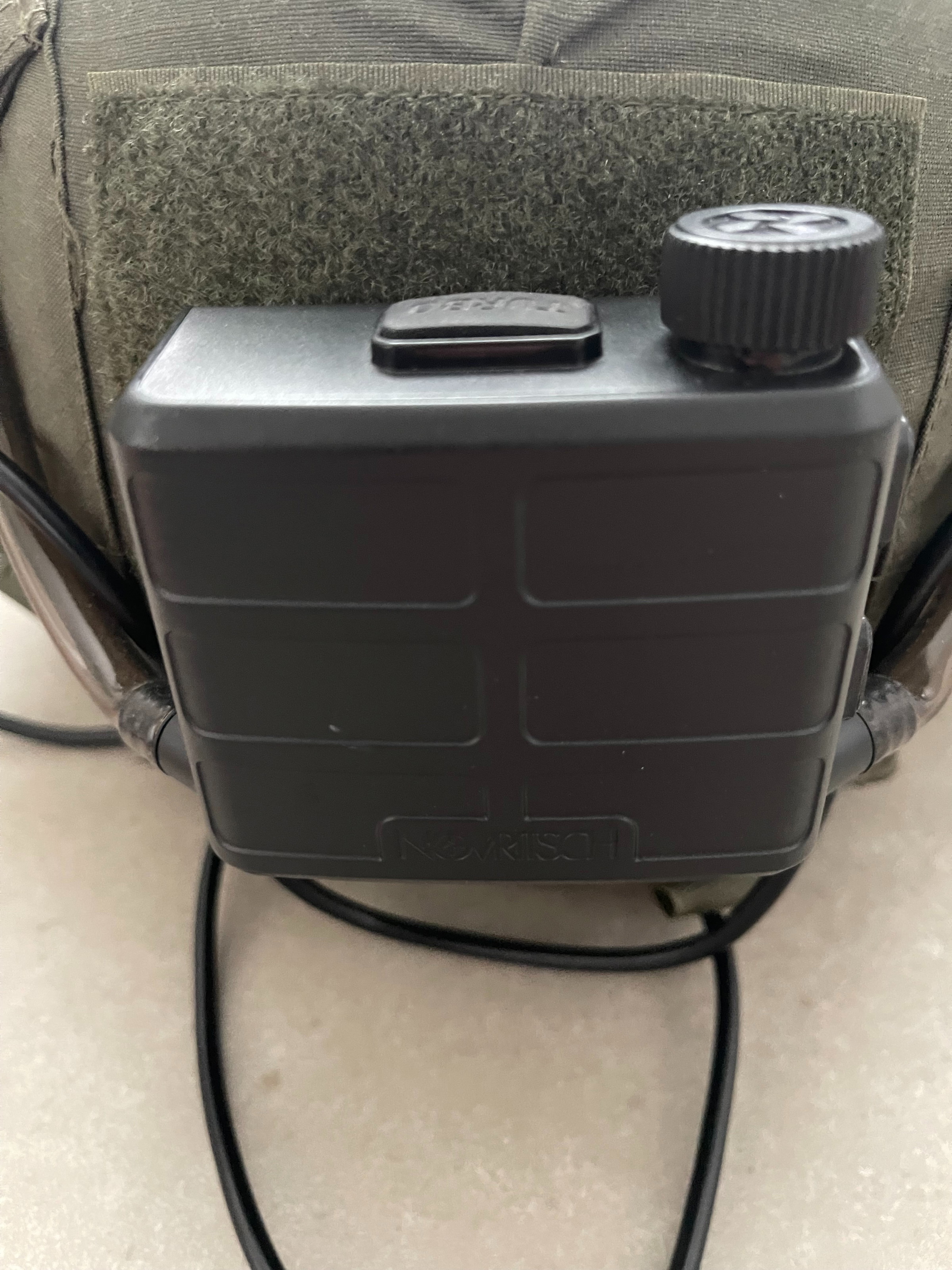 Achterop de helm is een NOVRITSCH Defog geplaatst, waarbij de luchtleidingen met een magneetje op de bril aansluit.
