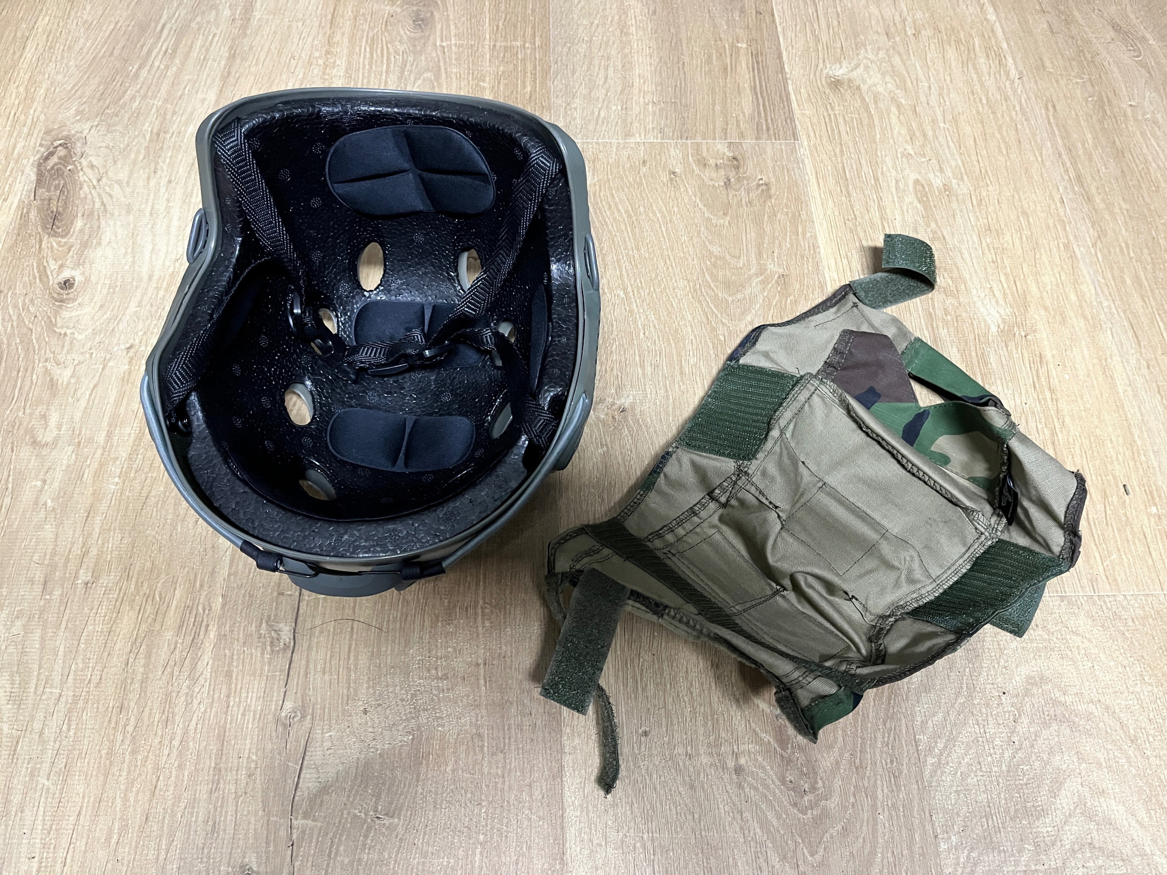with a brandnew helmet cover (Woodland) by Invader Gear (€12,90 - see pricetag in picture).