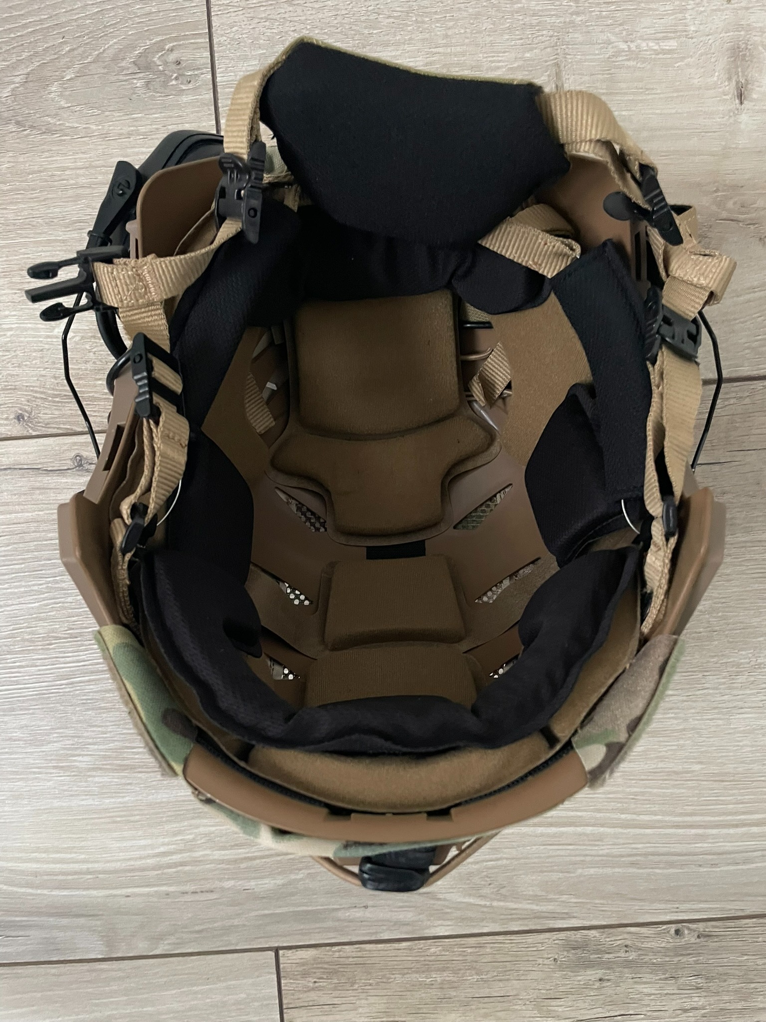 FMA EXF Bump helm Dark Earth met Multicam Cover, Earmor M32 headset en Anti Fog device.