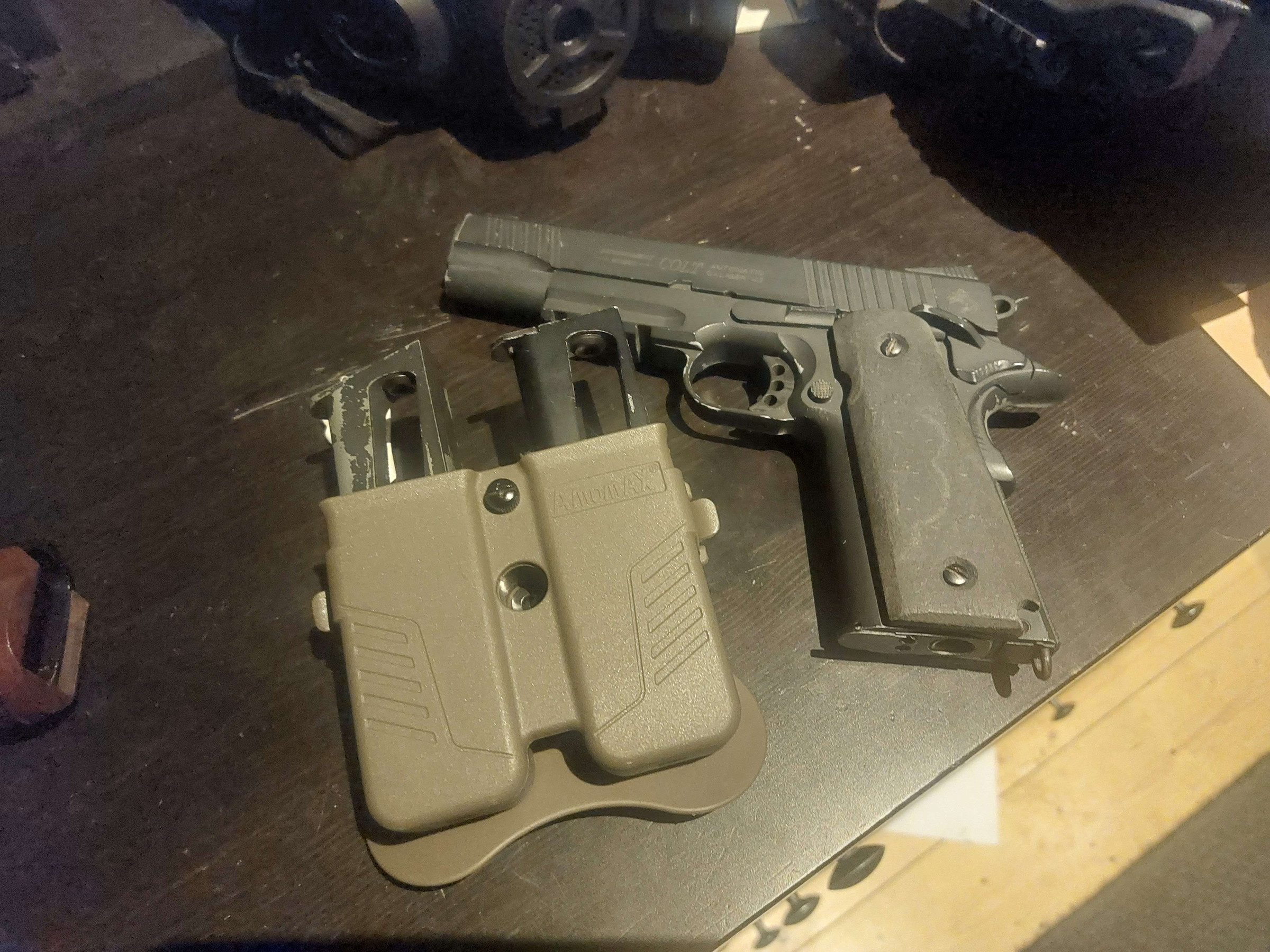EN - M1911 Colt black mat Co2 pistol with custom made grips (original grips in the box). Includes 2 extra magazines (along with the magazine in the replica), a tan magazine belt carrier and a custom transport box. All that is shown is included in the price.  Shipping fees are at the buyer's expense.