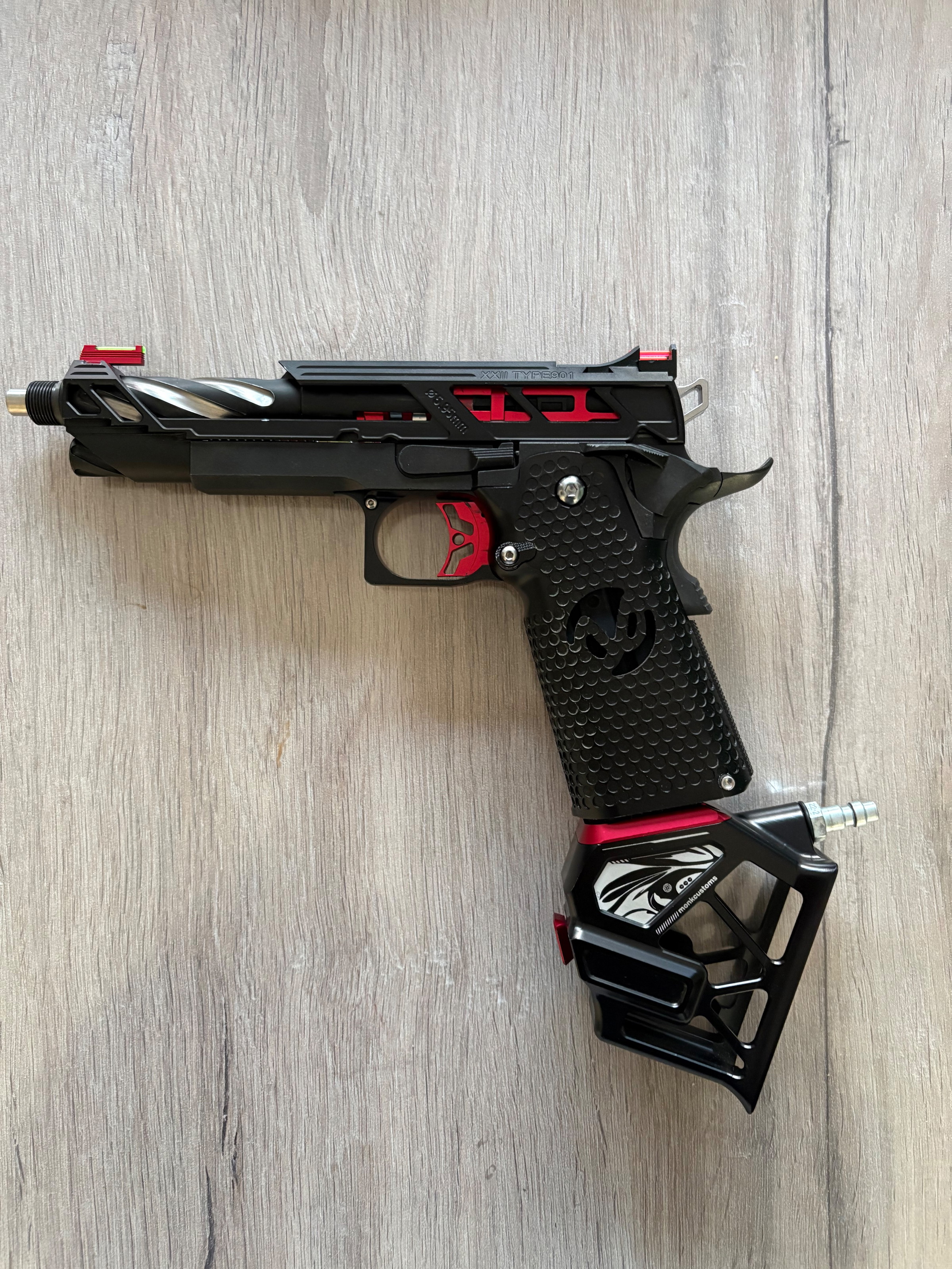 Full opgrade hi capa 5.1 met nog onderdelen bij zoals frame dr black voor er op te zetten en de origenele stukken              Parts                                                                         Loading nozzle , cow cow nozzle value , cow cow nozzle value blocker , inner barrel 138 mm , dr black front sight , monk adapter , masterpiece grip , alu slide dr black 901 , alu frame dr black 02 , alu hammer style red , alu hammer protection red , custom blowback housing red , red speed trigger , tti infinitie hop up chamber , edge blowback housing en nog veel meer dat ik ben vergeten ?  Word als een gans pakket verkocht weg wegen uitdunnen collectie heb je nog vragen stel ze gerust
