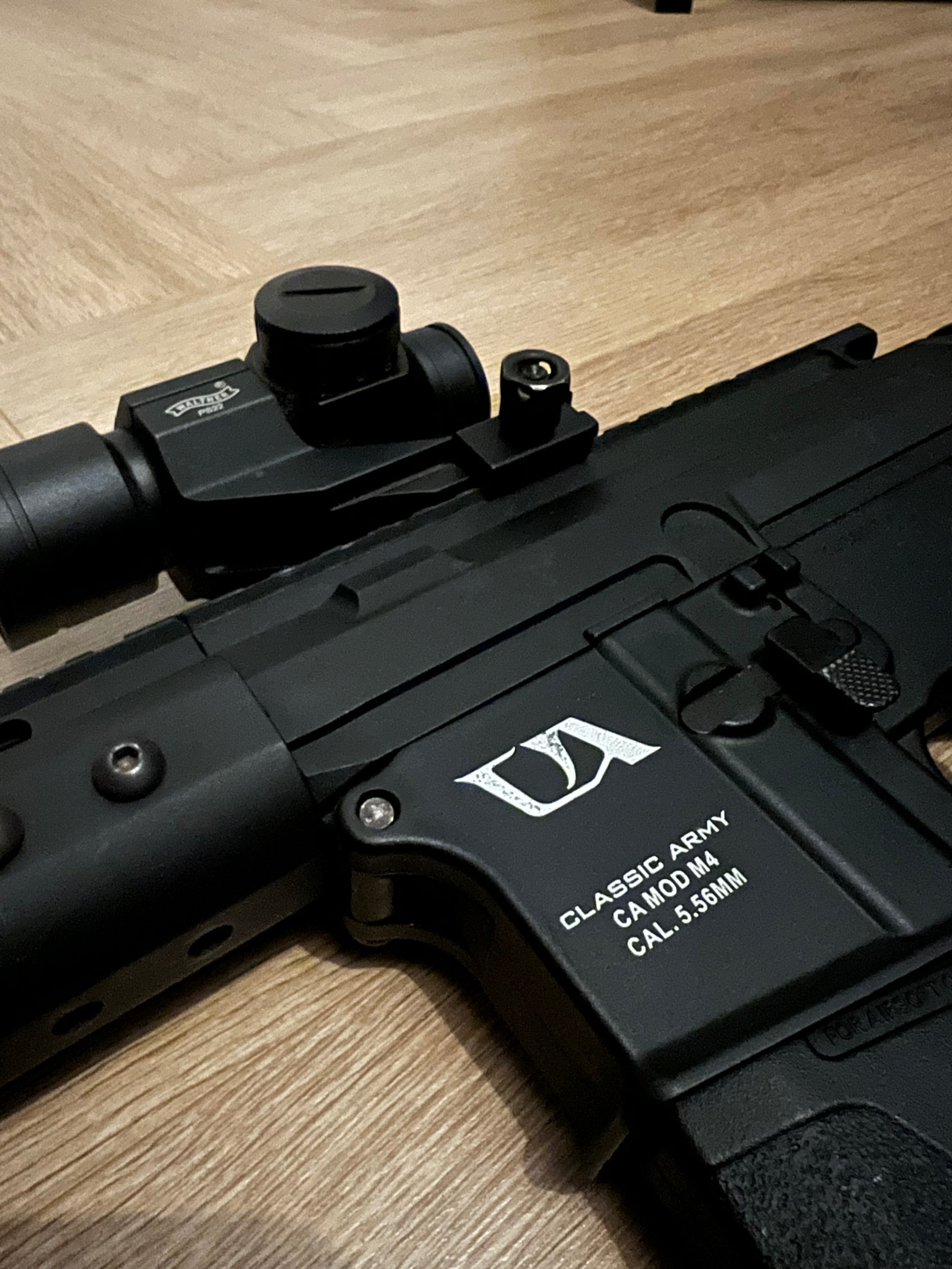 Een leuke clasic army m4 aeg met gate titan. Heeft het velt regelmatig gezien en schiet momenteel 0.9J met 0.25.