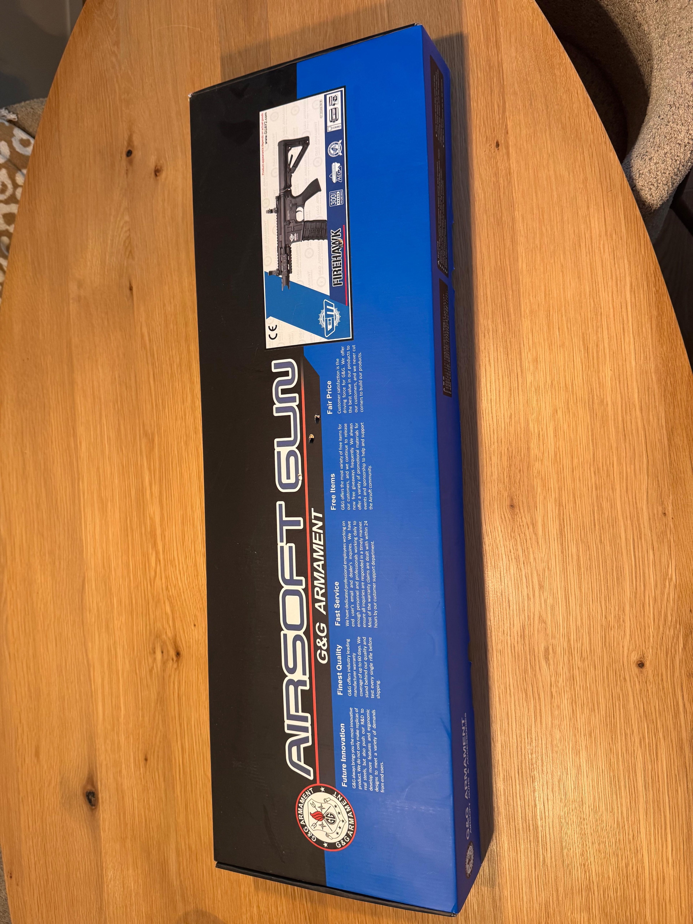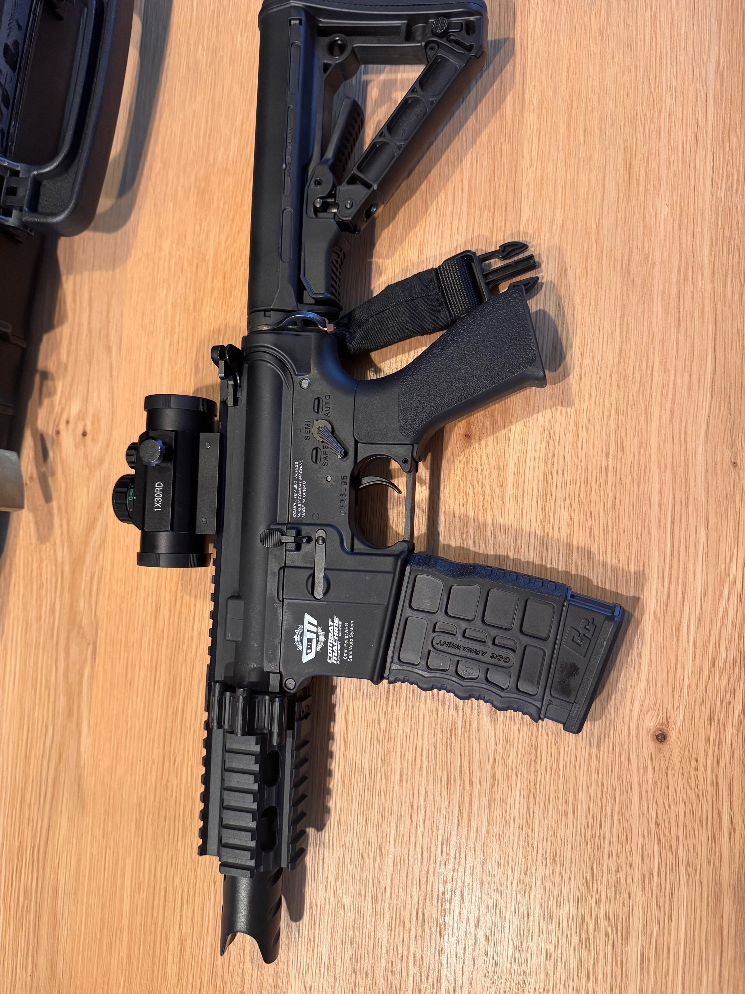 De set bevat ook twee magazijnen (niet afgebeeld). Er is een draagriem. Er is geen batterij. Er zijn standaard vizierrails, maar die verkoop ik samen met de richtkijker. Er is ook een koffer bij (zie foto). Mocht je interesse hebben in de koffer, dan kost die 50 euro.