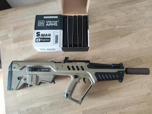 Heavily upgraded S&T Tavor/Tar 21+10 specna Arms midcaps.