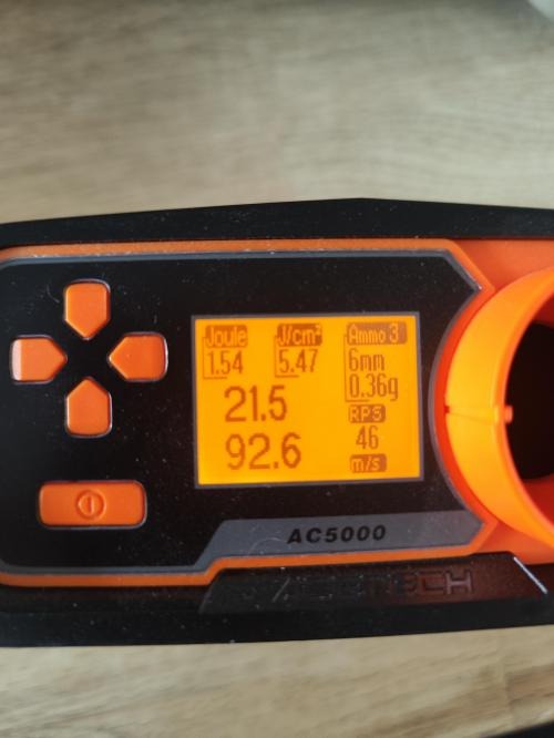 Shoots around 1.5 joules with 0.36g bbs at 21-22 RPS.