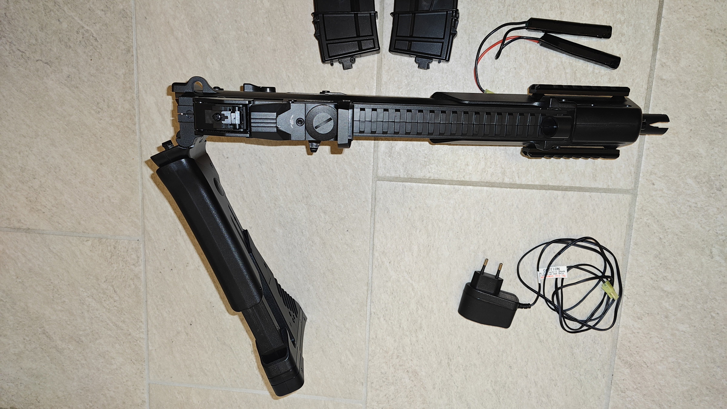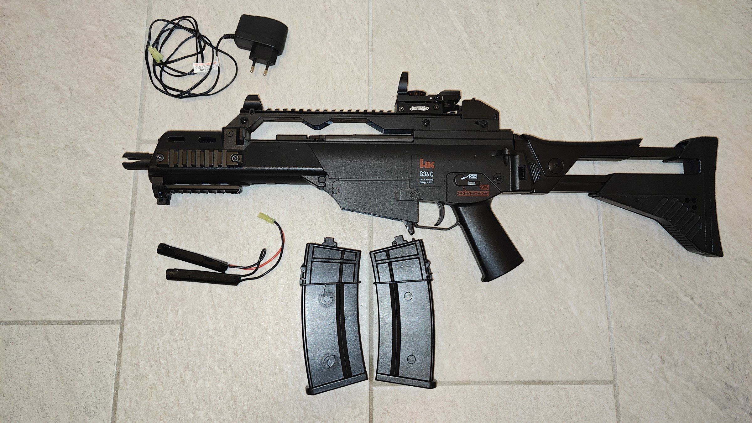 gut erhaltene Nachbau mit H&K-Lizenz, originalgetreuen Markings besitzt ein Dual Power (elektrisch + manuelle Vorspannung mit beidseitig ausklappbarem Metallhebel) System. Ein elektrisches BlowBack (EBB) System simuliert einen authentischen Rückstoß des Hebels. Die G36C kann halb ,aber auch vollautomatisch eingesetzt werden. Mit 0,5 Joule kann die G36C in Deutschland von 14 Jährigen geführt werden, erreicht trotzdem noch eine kräftige Schussreichweite von etwa 30m. Der verstell- und klappbare IDZ-Schaft ermöglicht es die Waffenlänge in 5 Längen einzustellen. Außen einstellbares Hop-Up, koppelbare Magazine, Kimme in 2 Positionen. Gehäuse aus robustem ABS-Polymer, Lauf und kritische Teile aus Metall.